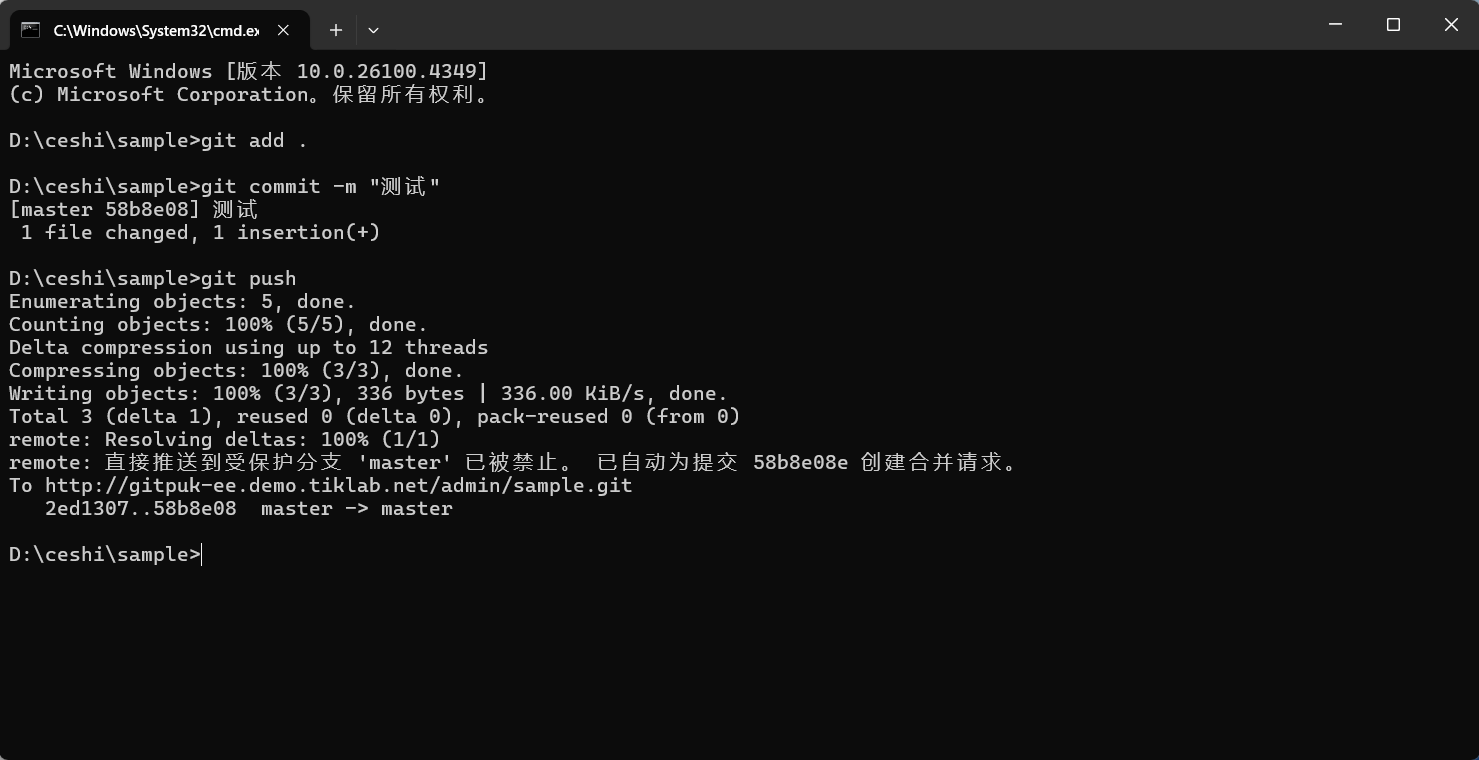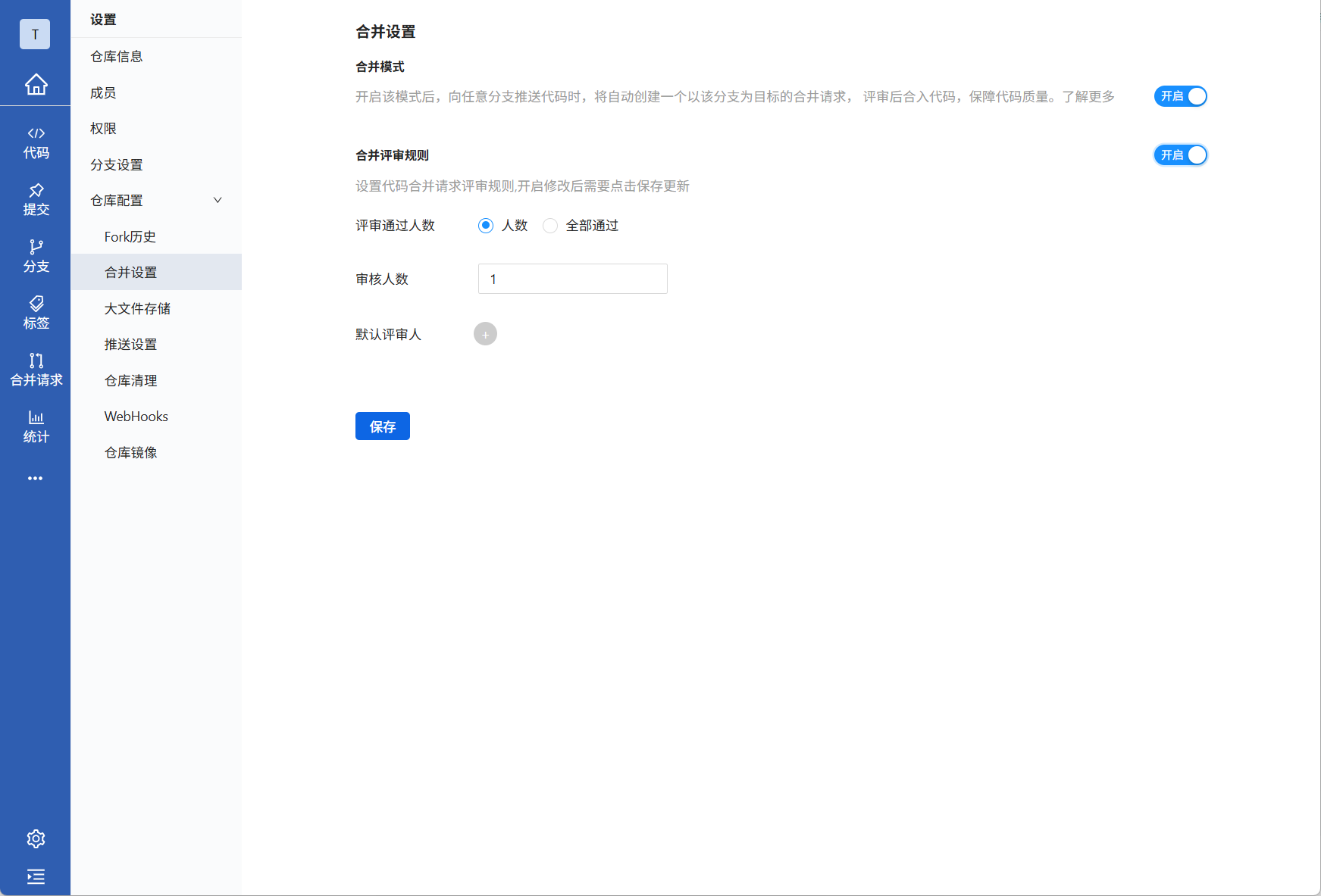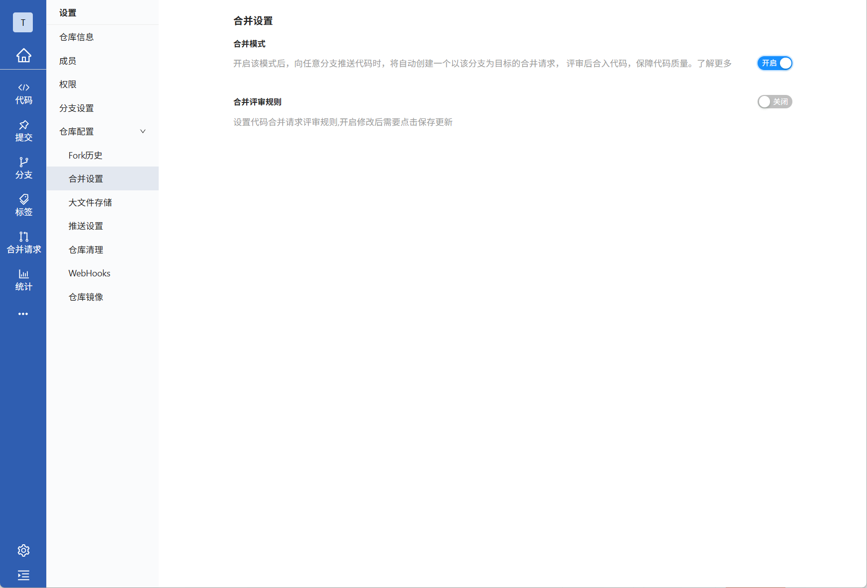 4.点击合并模式,打开合并模式后所有分支都会变成保护分支,往任意分支推送都会自动创建合并请求