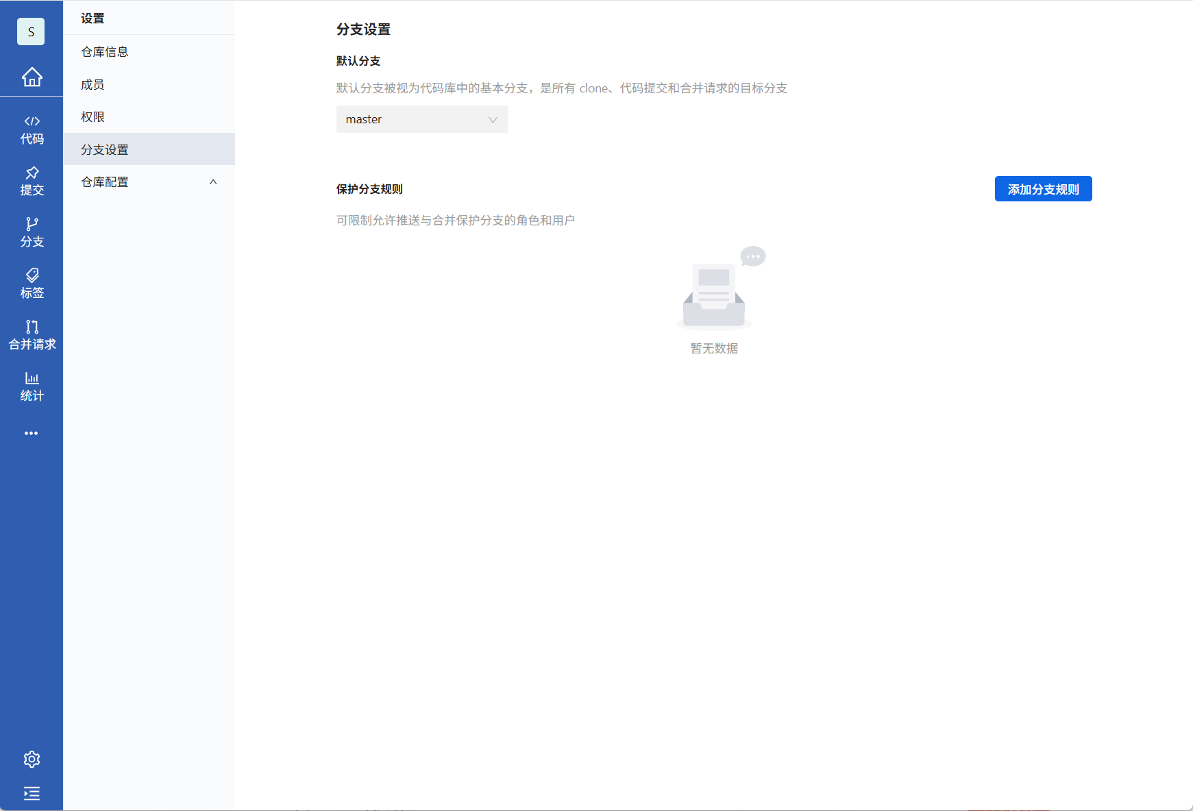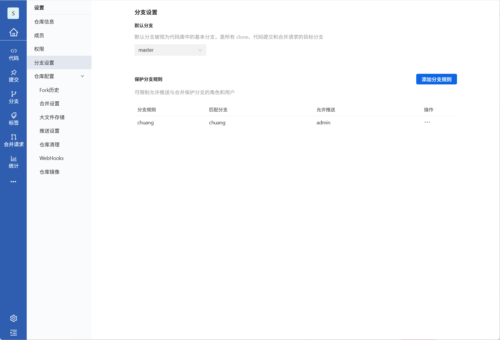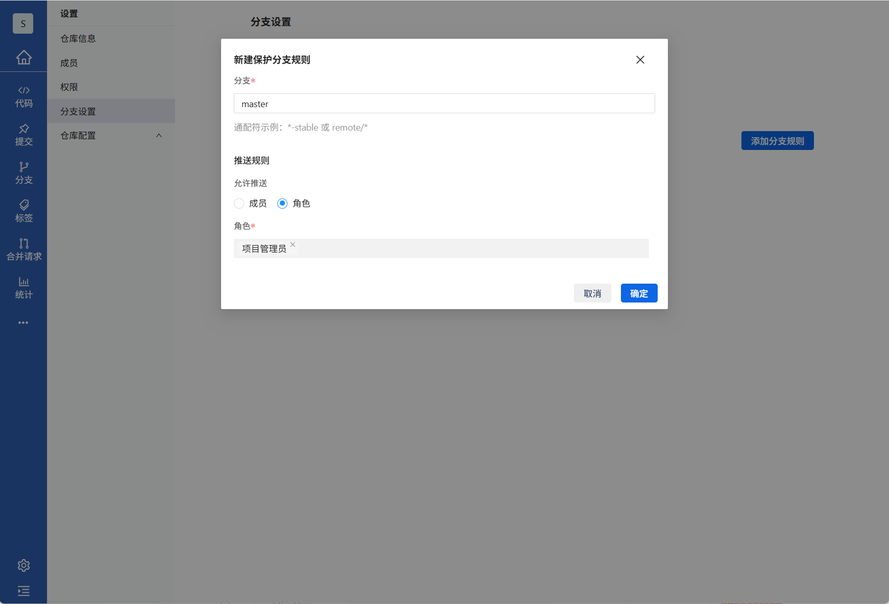 4.点击添加分支规则,输入需要保护的分支名称,选择指定角色或成员才能推送到该分支,选择成功后点击确定即可