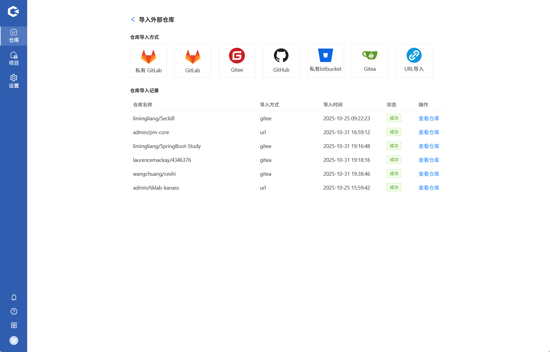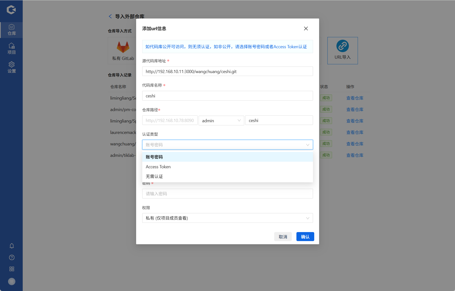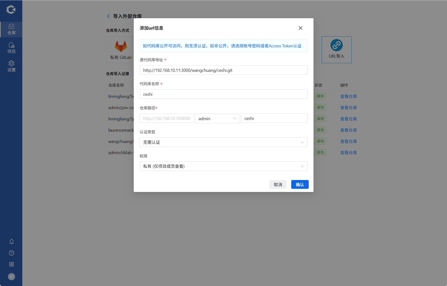 2.点击URL导入,输入源代码库地址后系统会自动选择仓库名称、仓库路径