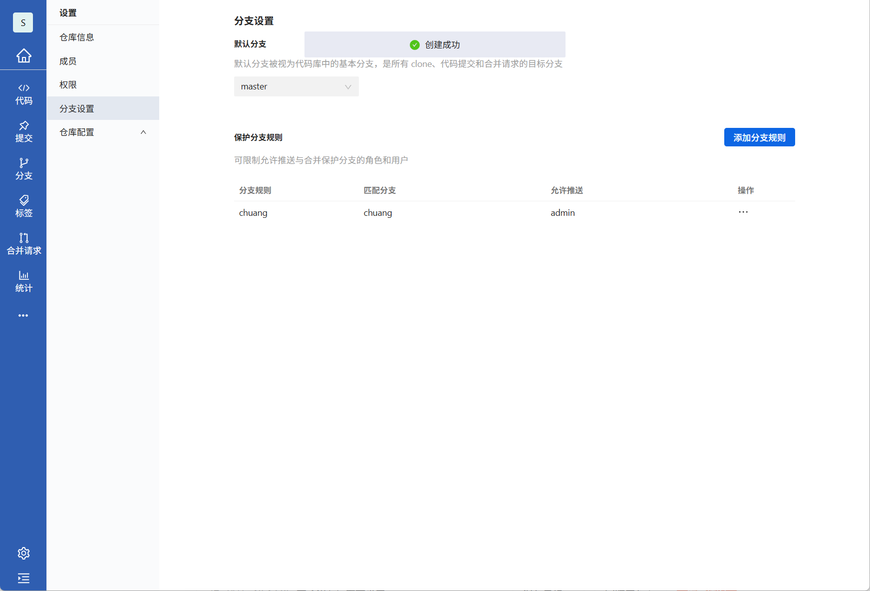 5.点击确定后,页面提示创建成功设置完成后只有该指定成员或者角色可向保护分支推送代码,其余成员无法推送