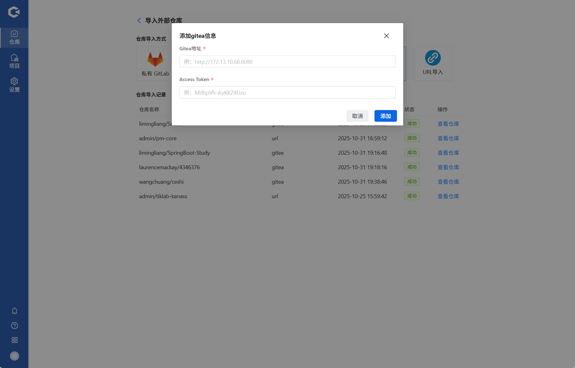 2.点击Gitea,输入对应Gitea地址、Access Token点击确定即可