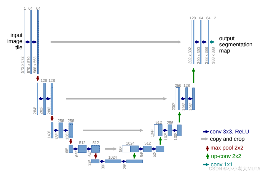 - 缓解梯度消失,促进训练:跳跃连接提供了梯度的直接传递路径,帮助网络更好地训练。