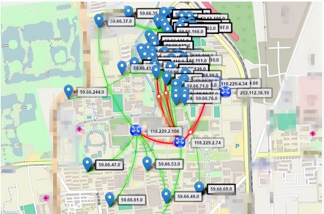 内部网络可视化:清晰展示如大学、企业园区中,不同教学楼或办公楼之间的网络是如何连接和分区的。例如,某大学的网络流量在核心机房后,通过路由器被划分为南北两个逻辑部分,并在楼宇间存在进一步的路由关系。