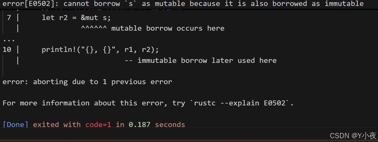fn main() {let mut s = String::from("hello");// 创建不可变引用r1let r1 = &s;// 同一时间创建可变引用r2,编译报错let r2 = &mut s; // 错误原因:cannot borrow `s` as mutable because it is also borrowed as immutableprintln!("{}, {}", r1, r2);