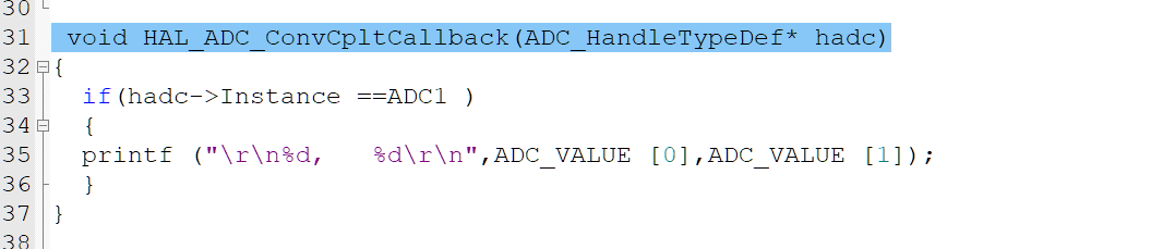 ADC的回调函数也是一样,全部ADC共用这个函数,所有使用时也要判断一下是那个触发的函数