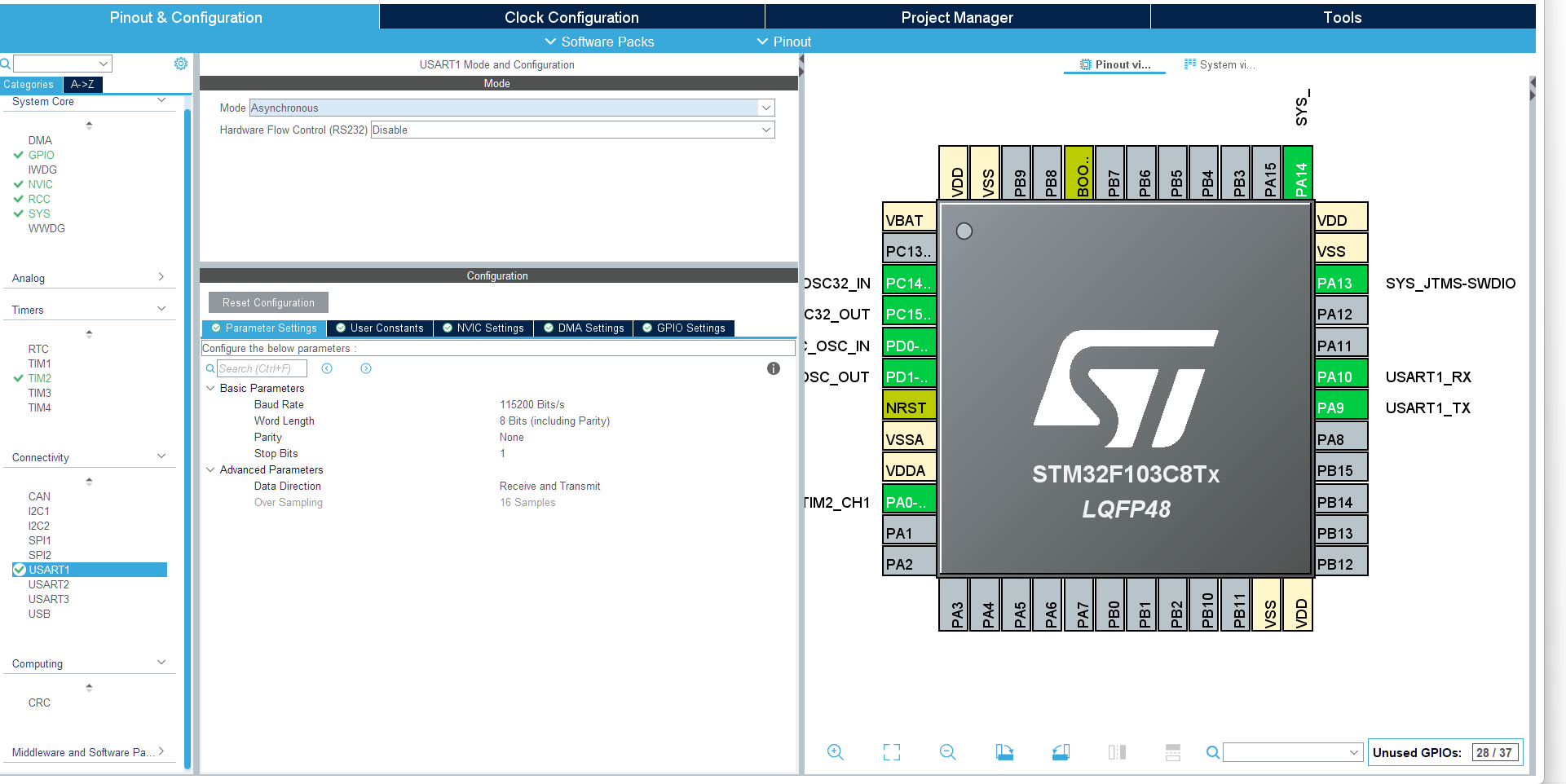要启用中断回调函数必须在配置串口时配置串口的中断,图中的nvic,当使用非阻塞式接收函数和发送函数带IT的函数,就会进入这个函数,这个函数是所有串口共用的,使用时要判断是那个串口触发的这个函数