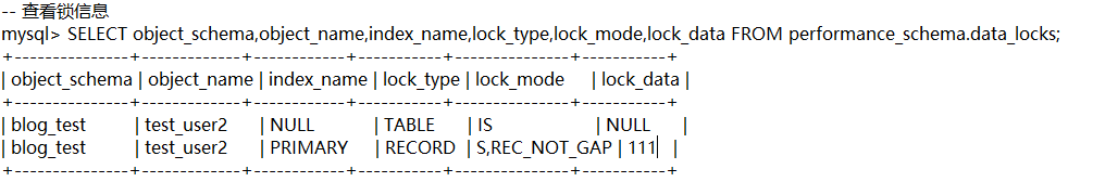 select object_type,object_schema,object_name,lock_type,lock_duratio from performance_schema.data_locks;