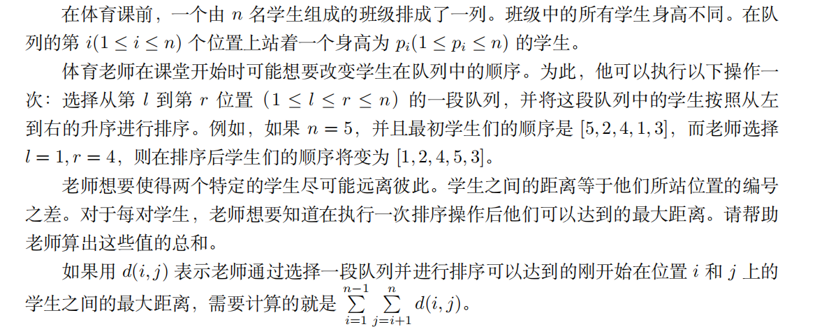 有nnn个元素,你可以选择lll和rrr两个位置(1≤l≤r≤n1\leq l\leq r\leq n1≤l≤r≤n),在这两个位置所构成的区间内(l≤i≤rl\leq i\leq rl≤i≤r)的所有元素将从左往右升序排序,然后求每两个元素排序后的最大距离的和