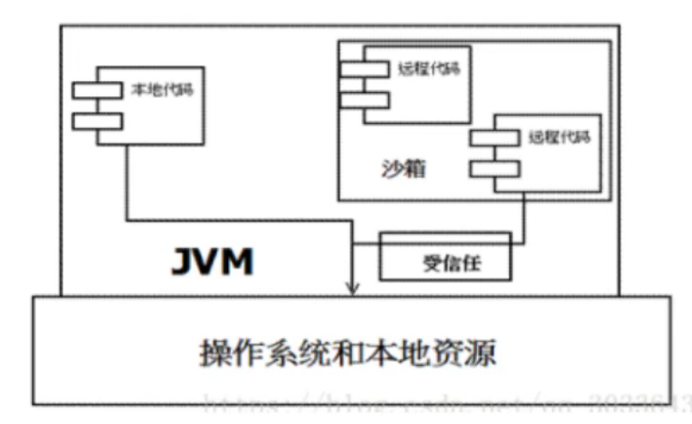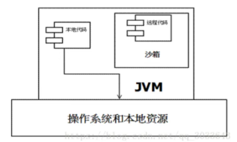 在Java中将执行程序分成本地代码和远程代码两种,本地代码默认视为可信任的,而远程代码则被看作是不受信的。对于授信的本地代码,可以访问一切本地资源。而对于非授信的远程代码在早期的Java实现中,安全依赖于沙箱(Sandbox)机制。如下图所示JDK1.0安全模型