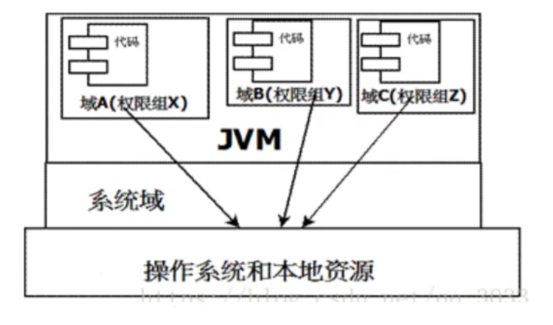 最新的安全机制实现,则引入了域(Domain)的概念。虚拟机会把所有代码加载到不同的系统域和应用域,系统域部分专门负责与关键资源进行交互,而各个应用域部分则通过系统域的部分代理来对各种需要的资源进行访问。虚拟机中不同的受保护域(Protected Domain),对应不一样的权限(Permission)。存在于不同域中的类文件就具有了当前域的全部权限,如下图所示的安全模型(jdk 1.6)