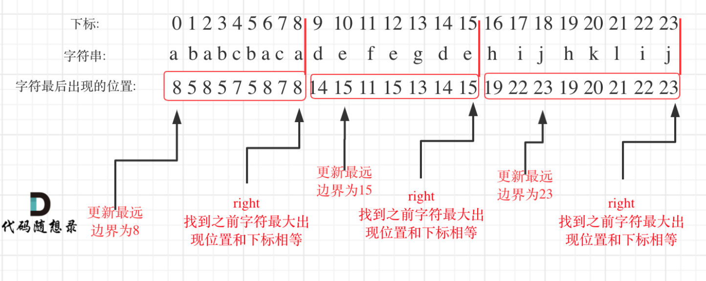 (2)从头遍历字符,并更新字符的最远出现下标,如果找到字符最远出现位置的下标和当前下标相等了,就说明找到了分割点。