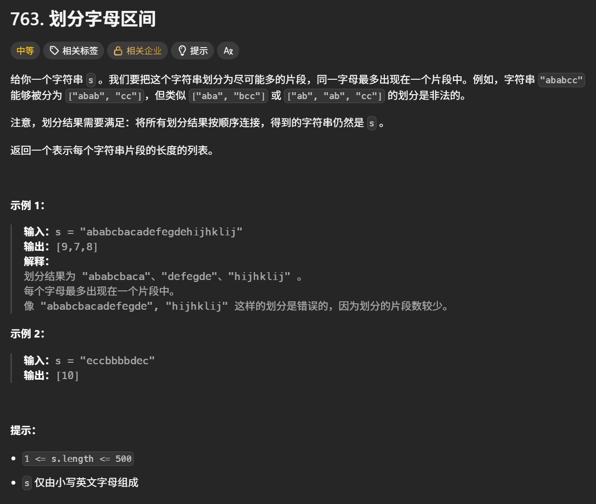 class Solution {public List<Integer> partitionLabels(String s) {List<Integer> res = new LinkedList<>();int[] edge = new int[26]; //i为字符,edge[i]为字符出现的最后位置char[] chars = s.toCharArray();for(int i = 0;i < chars.length;i ++){ //统计每一个字符最后出现的位置edge[chars[i] - 'a'] = i;}int right = 0;int last = -1;for(int i = 0;i < chars.length;i++){right = Math.max(right,edge[chars[i] - 'a']); //动态更新当前区间的最远边界if(i == right){ //如果字符最远出现位置的下标和当前下标相等,说明找到了分割点res.add(i - last); //将分割点存入结果列表last = i; //起始位置更新为当前位置(即上一个片段的最后一个元素所在位置)}}return res;}