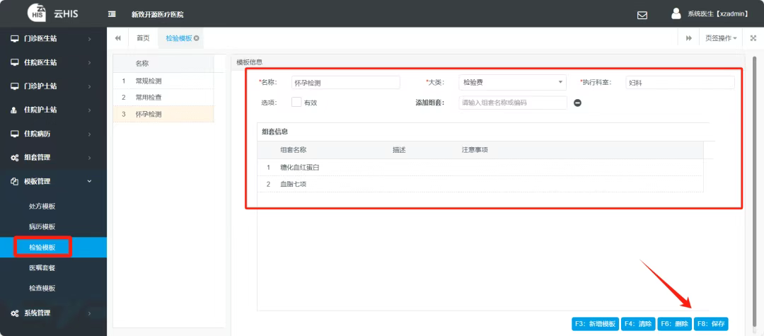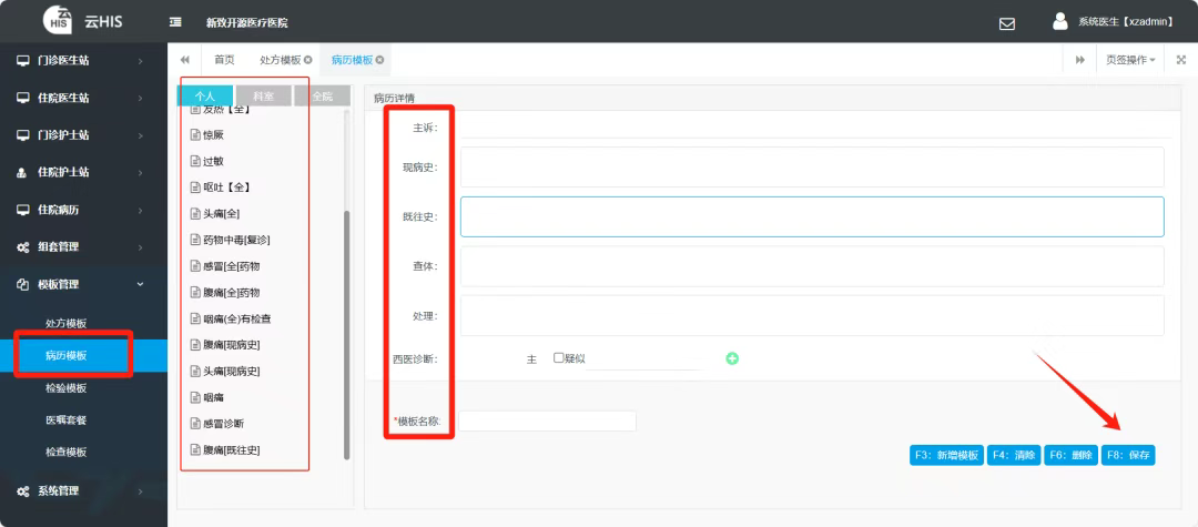 3.点击左侧菜单栏【病历模板】,添加新模板时,直接填写【病例详情】,点击【保存】,新建模板成功。