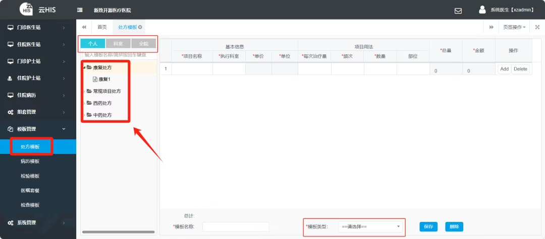 2.点击左侧菜单栏【处方模板】,可设置康复处方、常规项目处方、西药处方和中药处方,设置时可选择设置成个人、科室或者全院通用的。