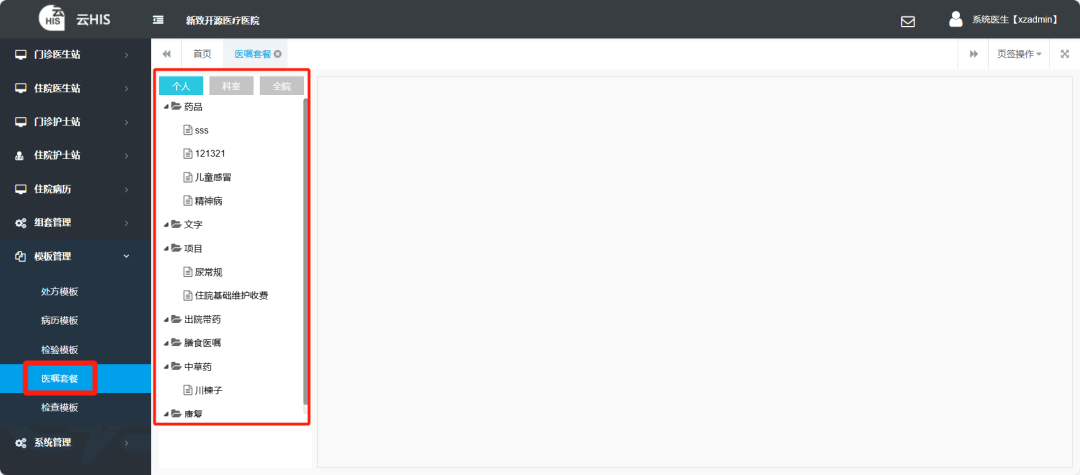 5.点击左侧菜单栏【医嘱套餐】,可设置药品医嘱、文字医嘱、项目医嘱、膳食医嘱、康复医嘱等,设置时可选择设置成个人、科室或者全院通用的。