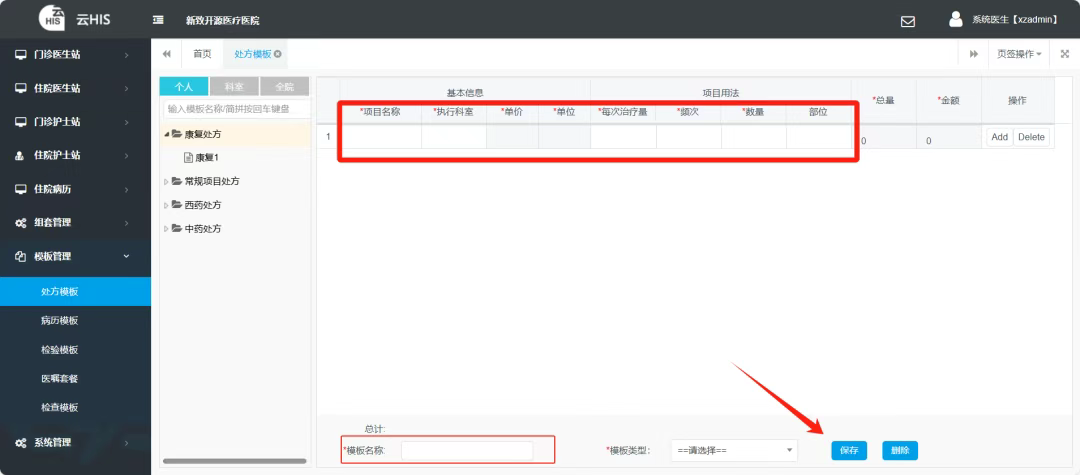 添加新处方模板时,单击处方名称,例如点击【康复处方】,填写基本信息、模板名称等必填项后,点击【保存】。