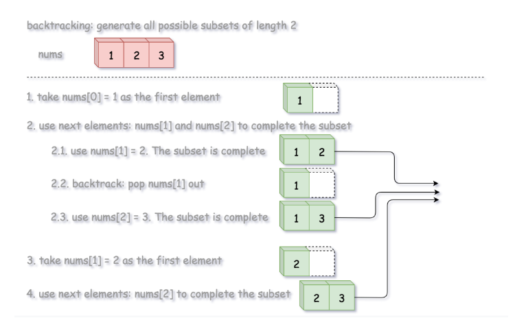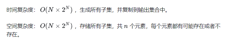 class Solution {List<List<Integer>> output = new ArrayList();int n, k;public void backtrack(int first, ArrayList<Integer> curr, int[] nums) {// if the combination is doneif (curr.size() == k)output.add(new ArrayList(curr));for (int i = first; i < n; ++i) {// add i into the current combinationcurr.add(nums[i]);// use next integers to complete the combinationbacktrack(i + 1, curr, nums);// backtrackcurr.remove(curr.size() - 1);}}public List<List<Integer>> subsets(int[] nums) {n = nums.length;for (k = 0; k < n + 1; ++k) {backtrack(0, new ArrayList<Integer>(), nums);}return output;}