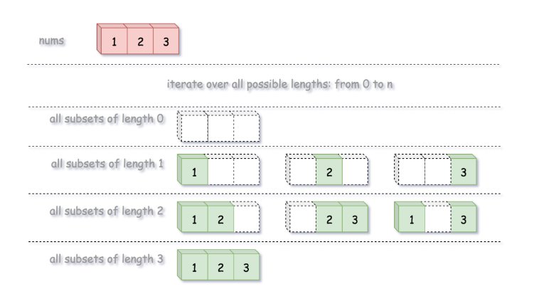 遍历 子集长度,通过 回溯 生成所有给定长度的子集。