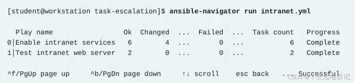 - name: Enable intranet serviceshosts: servera.lab.example.comtasks:- name: Tasks that require privilege escalationbecome: true # 为block块设置提权block:- name: latest version of httpd and firewalld installedansible.builtin.yum:name:- httpd- firewalldstate: latest- name: test html page is installedansible.builtin.copy:content: "Welcome to the example.com intranet!\n"dest: /var/www/html/index.html- name: firewalld enabled and runningansible.builtin.service:name: firewalldenabled: truestate: started- name: firewalld permits http serviceansible.posix.firewalld:service: httppermanent: truestate: enabledimmediate: true- name: httpd enabled and runningansible.builtin.service:name: httpdenabled: truestate: started- name: Test intranet web serverhosts: localhosttasks:- name: connect to intranet web serveransible.builtin.uri:url: http://servera.lab.example.comreturn_content: truestatus_code: 200
