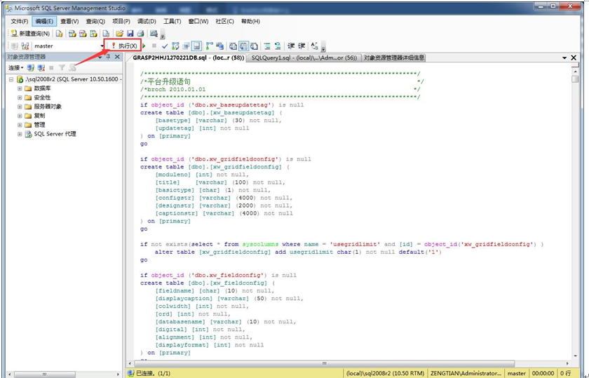 4、打开脚本文件后可以看很多 sql 语句,这时点击命令栏中的“!执行(X)”开始执行升级语句。