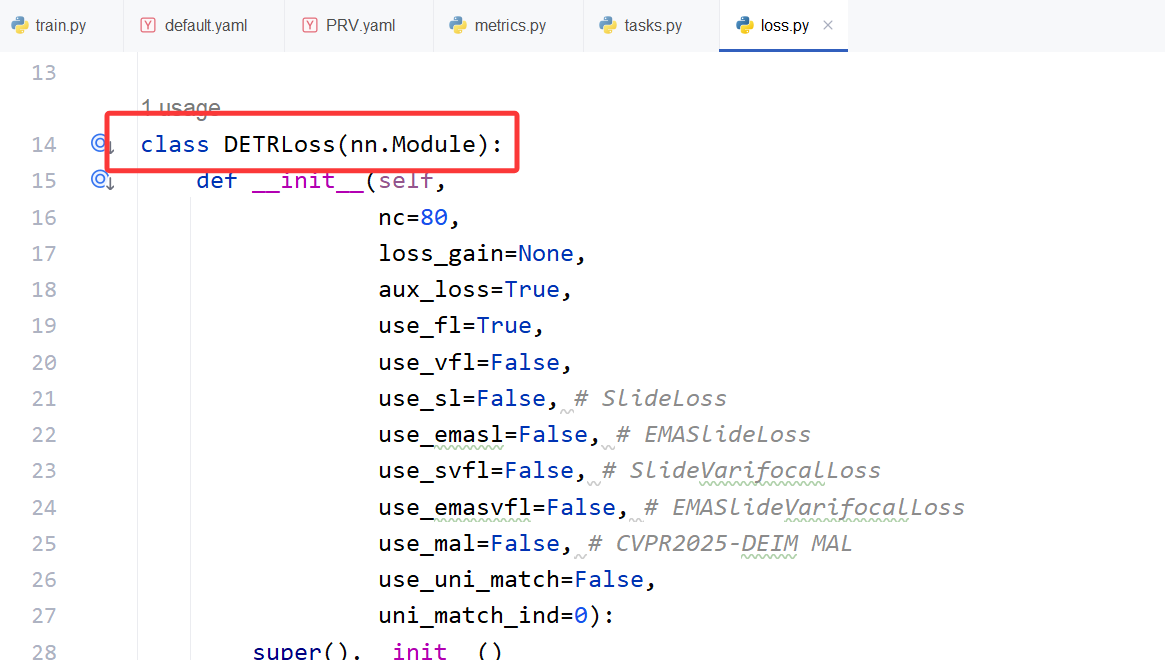 如果需要修改损失函数,可以通过继承DETRLoss来修改,或者创建自己的损失函数,具体的引用在以下目录:
