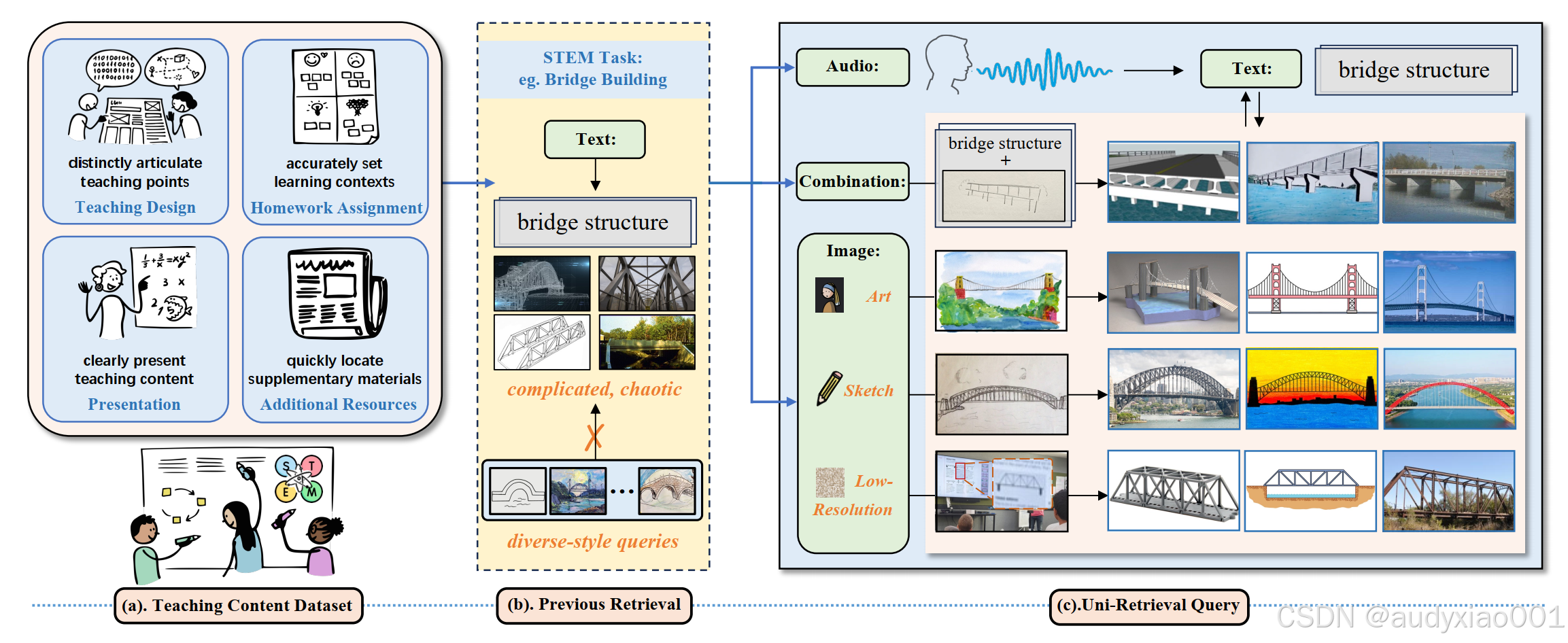 图1以“桥梁搭建”为STEM任务示例,清晰展示了STEM教育检索场景下的资源基础与检索方案对比,分为三部分:(a)为教学内容数据集,作为检索的资源支撑,涵盖教学设计、作业布置等与任务相关的教学内容;(b)为以往检索模型的局限,这类模型主要聚焦文本到查询检索,仅能处理单一的文本或音频等查询形式,难以适配教育场景的多样化需求;(c)为Uni-Retrieval的多风格查询设置,突破以往局限,支持文本、音频、草图、艺术风格图、低分辨率图等多种查询风格,还可实现多模态组合查询,能满足清晰呈现教学内容、快速定位补充资源等实际教学需求,为STEM教育提供更贴合教学场景的检索解决方案。