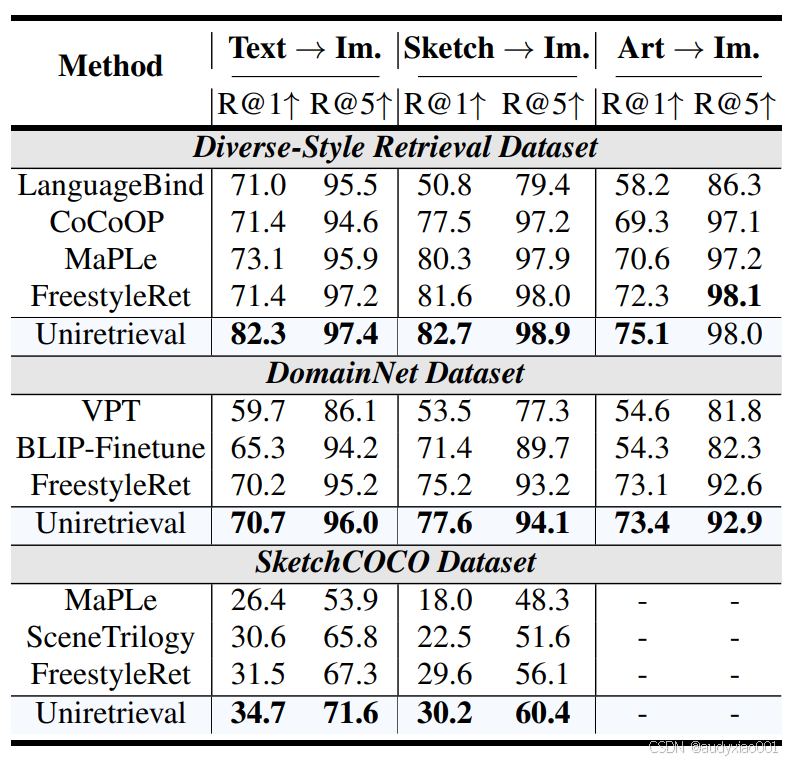 表5在Diverse-Style、DomainNet、SketchCOCO三个数据集上,Uni-Retrieval的检索性能均领先同类模型,例如Diverse-Style文本→图像R@1达82.3,SketchCOCO文本→图像R@1达34.7,展现出在未知数据集、小众风格(如草图)下的强泛化能力,可适配STEM教育资源的多样性。