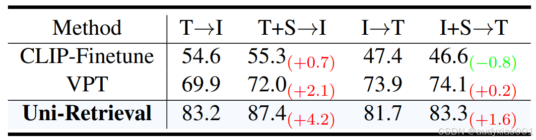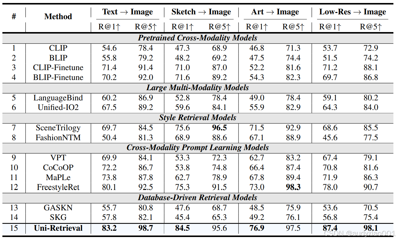 表1在“文本→图像、草图→图像、艺术图→图像、低分辨率图→图像”四类任务中,Uni-Retrieval的R@1/R@5指标均大幅领先其他模型,例如文本→自然图像R@1达83.2,草图→图像R@1达84.5,充分证明其对STEM教育中手绘、模糊图等多风格查询的精准适配能力。