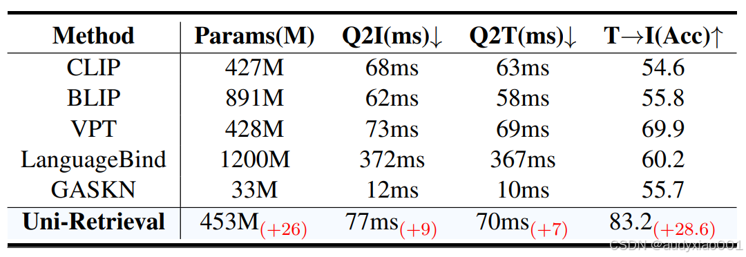 表2比较了模型之间的效率,Uni-Retrieval在仅增加26M参数,推理时间增加10ms的情况下,文本→图像准确率提升28.6,在“高精度”与“低计算开销”间实现平衡,契合教育场景的落地需求。