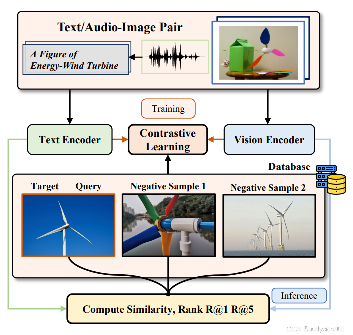 让模型学会“关联语义”输入为“文本/音频-图像对”。文本编码器:提取文本/音频的语义特征(如“风能”“涡轮机”的概念信息)。视觉编码器:提取图像的视觉特征(如涡轮机的叶片形状、结构布局)。对比学习(Contrastive Learning):让“相关特征”(如“风能涡轮机”文本与对应图像的特征)尽可能靠近,“无关特征”(如文本与“彩色水管装置”图像的特征)尽可能疏远,从而让模型学会“文本-图像”的语义关联。