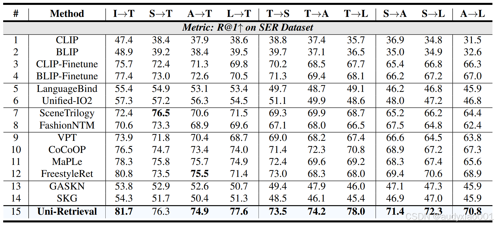 表4在SER数据集的“图像→文本、草图→文本”等10类跨模态任务中,Uni-Retrieval的R@1指标均为最高,如I→T达81.7、S→T达76.3,验证了其在STEM教育多学科、多模态检索任务中的全面优势。