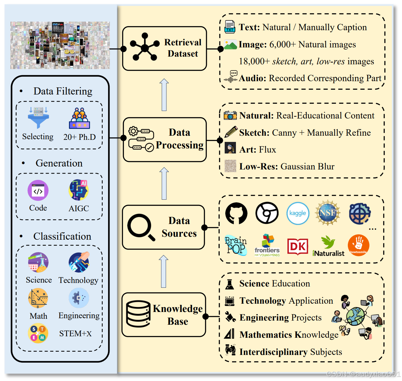 图2展示了面向STEM教育的多模态检索数据集构建流程:以涵盖科学教育、技术应用、工程项目等的知识库为基础,整合GitHub、Kaggle、NSF等多平台的数据源,通过对自然教育内容、使用Canny算法和人工优化的草图、Flux生成的艺术风格图、高斯模糊处理的低分辨率图等进行数据处理后,形成包含自然/人工标注文本、6000+自然图像与18000+草图、艺术和低分辨率图像、对应音频的检索数据集。同时左侧通过数据过滤(筛选+20余位博士参与)、生成(代码、AIGC技术)、分类(科学、技术、数学、工程、STEM+X跨学科)等环节,保障数据集在STEM教育场景下的多模态、多风格检索能力。