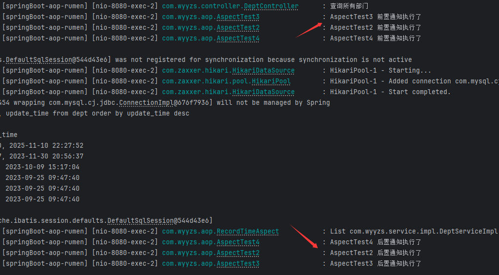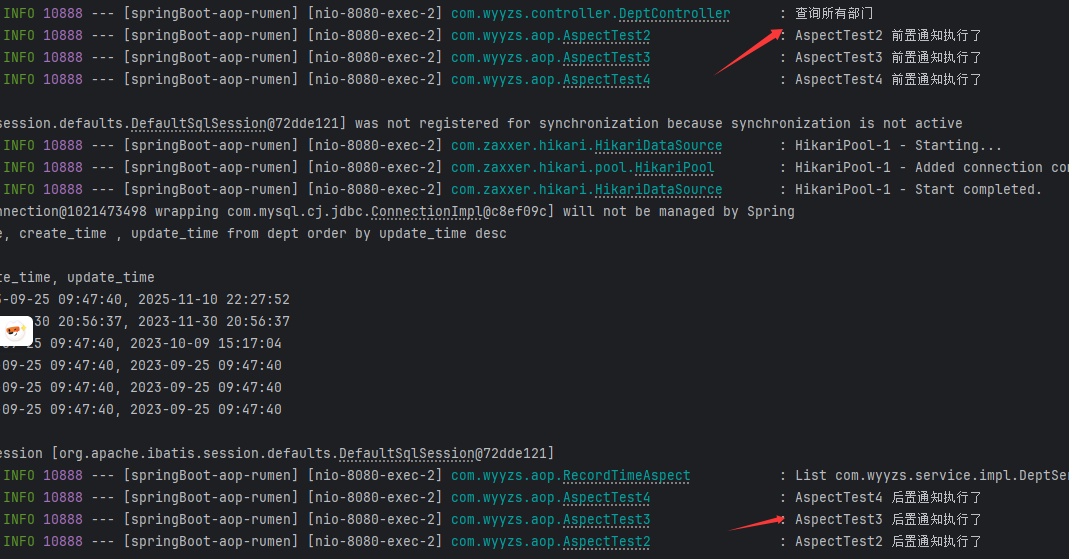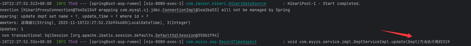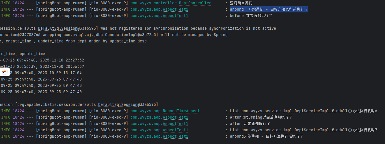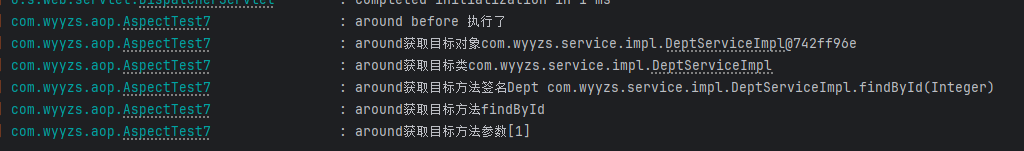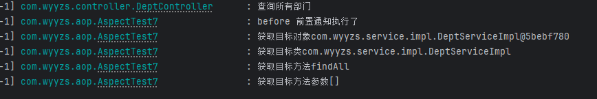 public class AspectTest7 {@Before("execution(* com.wyyzs.service.impl.DeptServiceImpl.*(..))")public void before(JoinPoint joinPoint){log.info("before 前置通知执行了");//1. 获取目标对象Object target=joinPoint.getTarget();log.info("获取目标对象{}" , target);// 2. 获取目标类String className = target.getClass().getName();log.info("获取目标类{}" , className);// 3.获取目标方法String methodName = joinPoint.getSignature().getName();log.info("获取目标方法{}" , methodName);// 4. 获取目标方法参数Object[] args = joinPoint.getArgs();log.info("获取目标方法参数{}" , Arrays.toString(args));}// @Around("execution(* com.wyyzs.service.impl.DeptServiceImpl.*(..))")public Object around(ProceedingJoinPoint joinPoint) throws Throwable{log.info("around before 执行了");//1. 获取目标对象Object target=joinPoint.getTarget();log.info("around获取目标对象{}" , target);// 2. 获取目标类String className = target.getClass().getName();log.info("around获取目标类{}" , className);// 获取目标方法签名Signature signature = joinPoint.getSignature();log.info("around获取目标方法签名{}" , signature);// 3.获取目标方法String methodName = joinPoint.getSignature().getName();log.info("around获取目标方法{}" , methodName);// 4. 获取目标方法参数Object[] args = joinPoint.getArgs();log.info("around获取目标方法参数{}" , Arrays.toString(args));return joinPoint.proceed();}