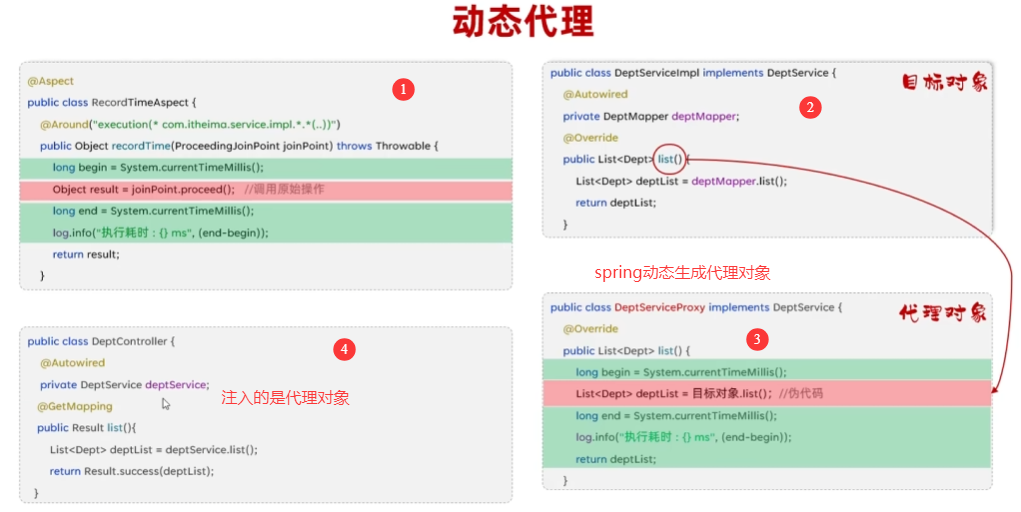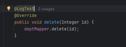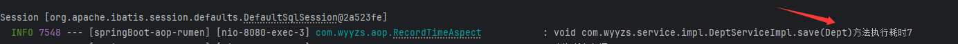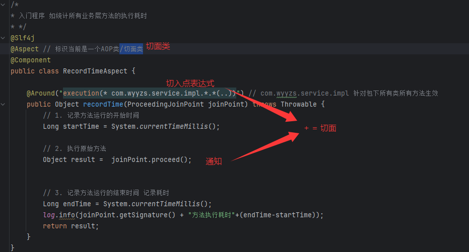 public class RecordTimeAspect {@Around("execution(* com.wyyzs.service.impl.*.*(..))") // com.wyyzs.service.impl 针对包下所有类所有方法生效public Object recordTime(ProceedingJoinPoint joinPoint) throws Throwable {// 1. 记录方法运行的开始时间Long startTime = System.currentTimeMillis();// 2. 执行原始方法Object result = joinPoint.proceed();// 3. 记录方法运行的结束时间 记录耗时Long endTime = System.currentTimeMillis();log.info(joinPoint.getSignature() + "方法执行耗时"+(endTime-startTime));return result;}
