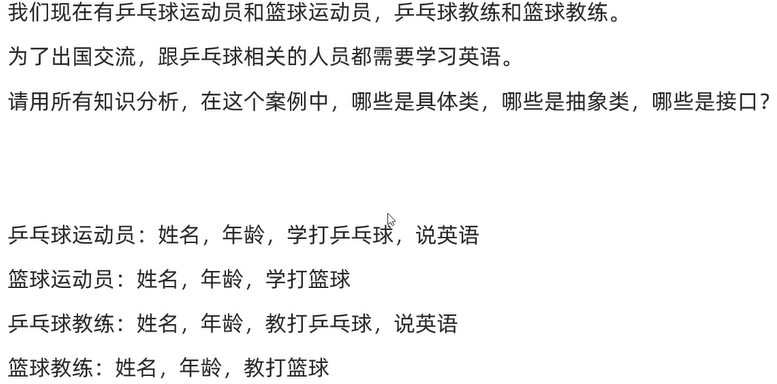 package com.jdL.day15classwork.question1;public class questionTest {public static void main(String[] args) {pingpangCoach coach = new pingpangCoach("张三",12);coach.learnEnglish();coach.teach();pingpangPlayer pingpangPlayer = new pingpangPlayer("张三壹",5);pingpangPlayer.learnEnglish();pingpangPlayer.study();baseketBallCoach coach2 = new baseketBallCoach("李四",18);coach2.teach();baseketballPlayer baseketballPlayer=new baseketballPlayer("李四贰",20);baseketballPlayer.study();}