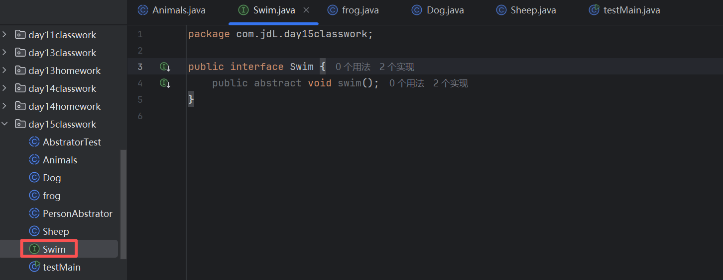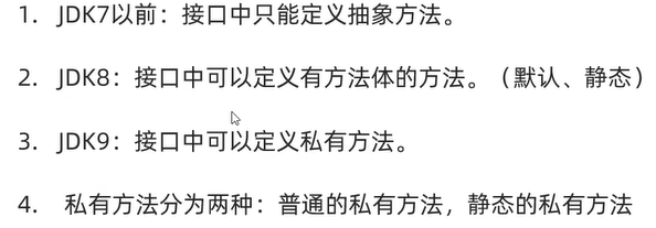 3、成员方法:JDK7以前,接口中只能写抽象方法,默认修饰符public abstract