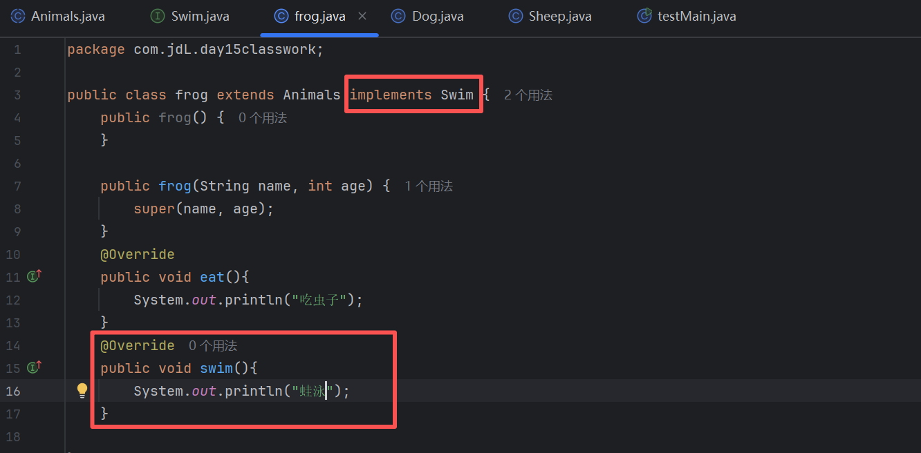 package com.jdL.day15classwork.question1;public class pingpangCoach extends coach implements learnEnglish {public pingpangCoach() {}public pingpangCoach(String name, int age) {super(name, age);}@Overridepublic void teach() {System.out.println("教学乒乓球");}@Overridepublic void learnEnglish() {System.out.println("学英语");}