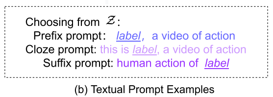 本文制作了两种提示词,即文本提示词和视觉提示词。前者对于标签文本扩展具有重要意义。给定一个标签 y,我们首先定义一组允许值 Z,然后通过填充函数 ffill (y, z) 获得提示性文本输入 y,其中 z∈Z。ffill 有三种类型,分别是前缀提示词、完形填空提示词和后缀提示词。它们是根据填充位置来分类的。