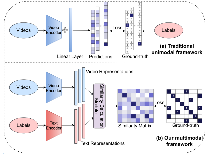 相比于传统的动作识别任务:将标签映射为数字或 one-hot 向量,而 actionclip利用标签文本本身的语义信息并尝试将相应的视频表示拉近。本文旨在实现两个任务:1、通过更多语义语言监督增强传统动作识别的表示;2、使模型能够实现零样本迁移,而无需任何额外的标记数据或参数要求。框架包括两个分别用于视频和标签的单模态编码器以及一个相似度计算模块。训练目标是使成对的视频和标签表示彼此靠近,这其实还是clip的实现方法,将问题建模为 P (f (x|y)),其中 y 是标签的原始文本,f 是一个相似性函数。那么,测试更像是一个匹配过程,得分最高的标签文本就是分类结果。