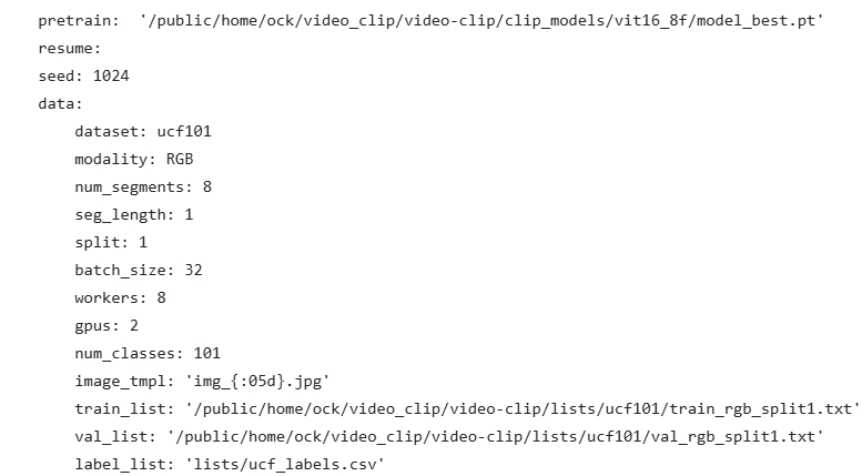 需要调整ucf_train.yaml下的数据集读取路径,读取你的划分文件读取路径和预训练权重路径(pretrain和train_list和val_list):