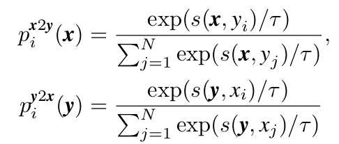 softmax归一化的视频到文本和文本到视频的相似度得分可以计算为如图公式:其中τ 是可学习的温度参数,N 是训练对的数量。 令qx2y(x)、qy2x(y)表示真实相似度分数,其中负对的概率为0,正对的概率为1。