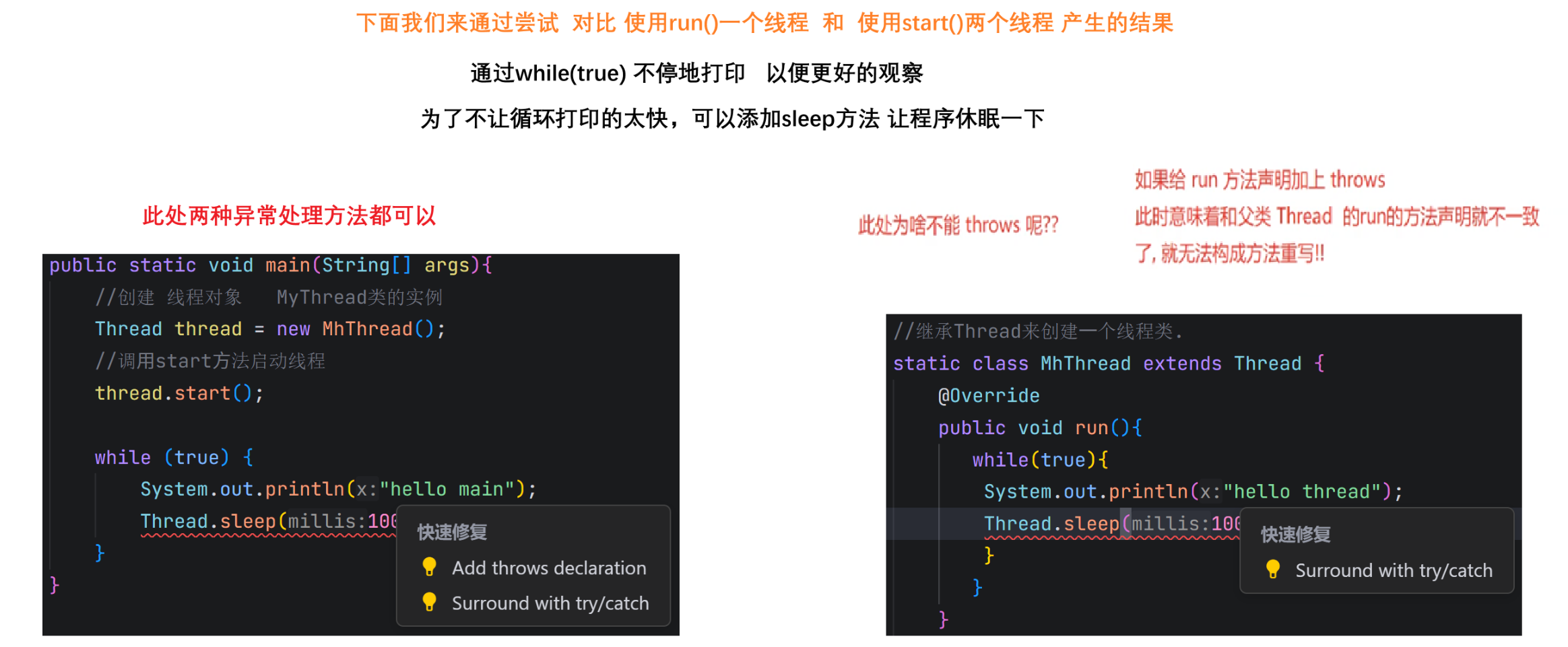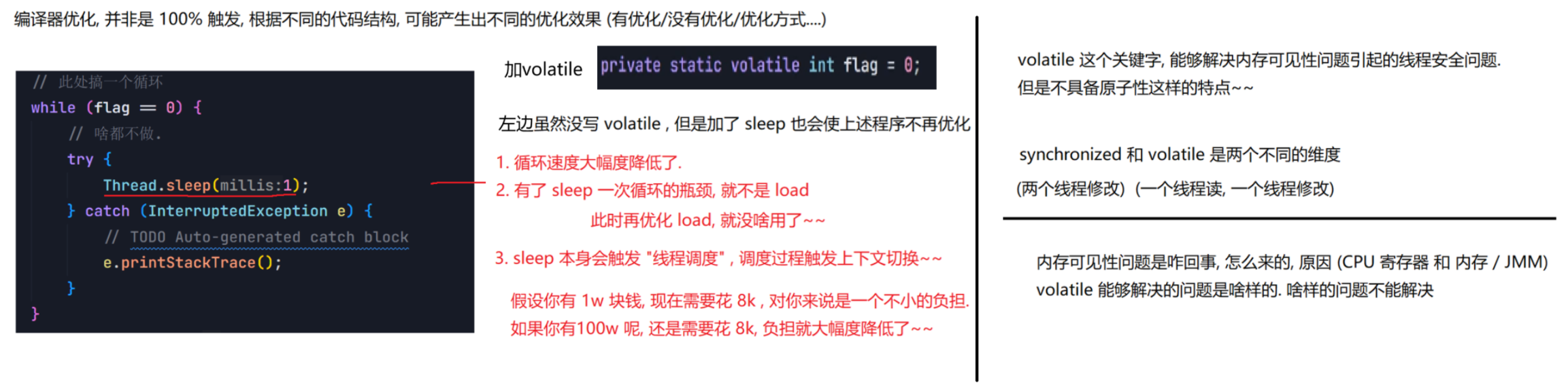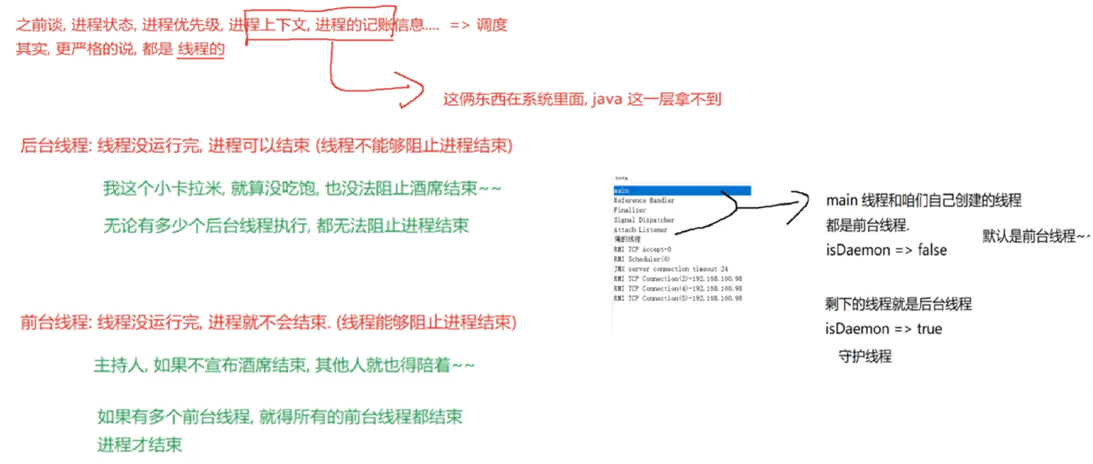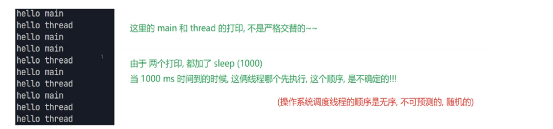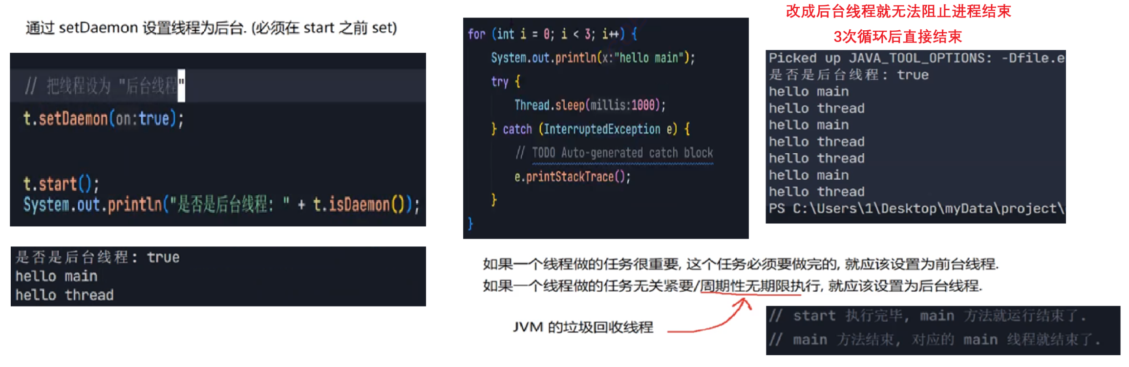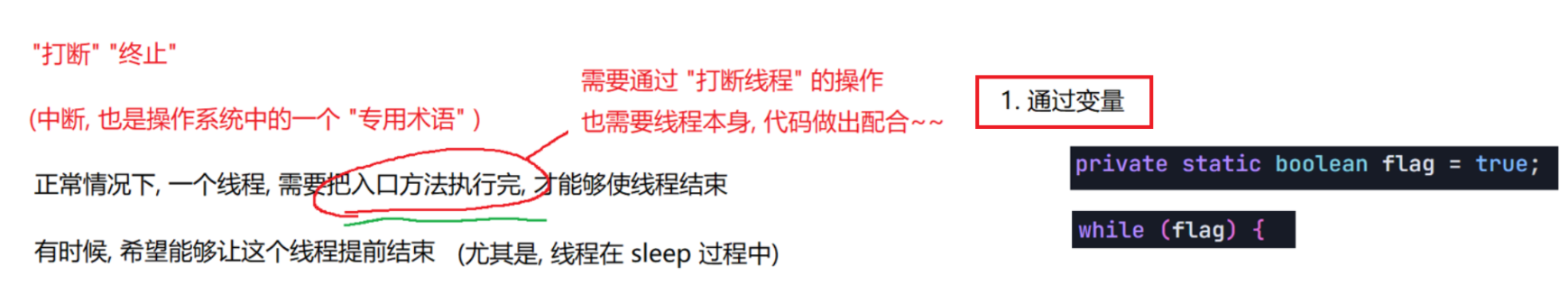 package thread;public class Demo7 {private static boolean flag = true;public static void main(String[] args) throws InterruptedException {Thread t = new Thread(() -> { while(flag){System.out.println("hello thread");try {Thread.sleep(1000);} catch (InterruptedException e) {// TODO Auto-generated catch blocke.printStackTrace();}}});t.start();System.out.println("hello main");Thread.sleep(3000);flag = false;System.out.println("让 t 线程终止");}}
