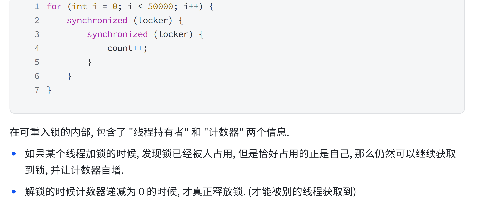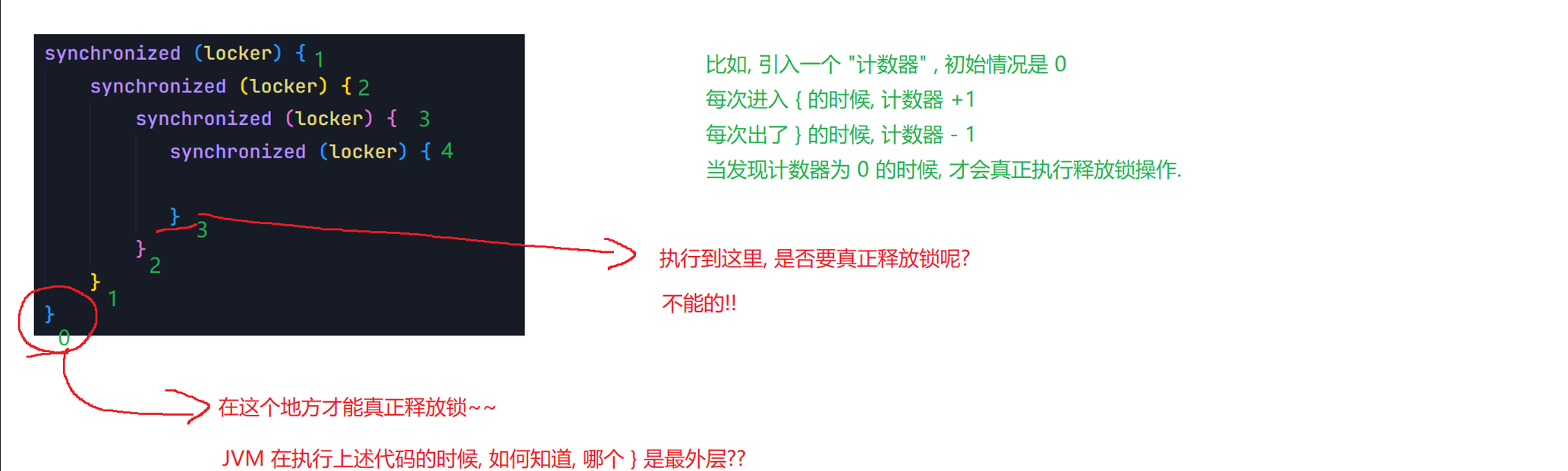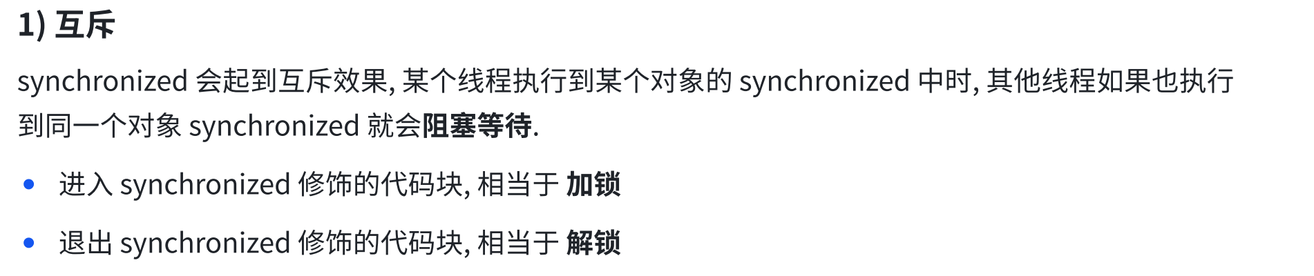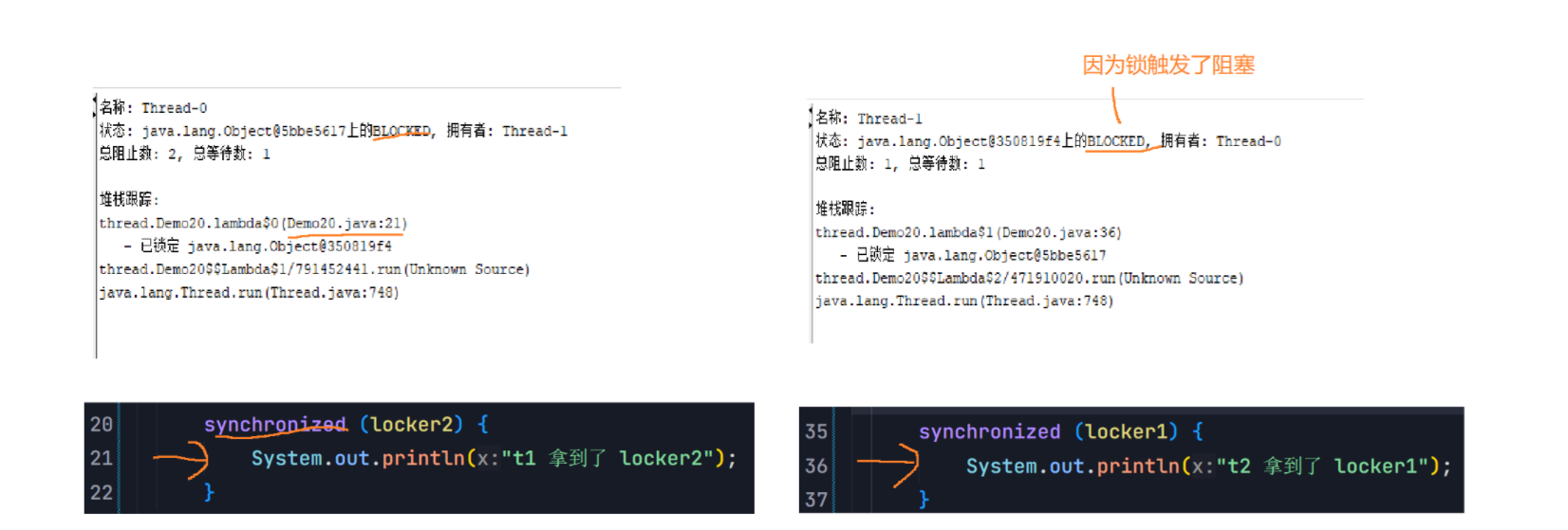 Object lock1 = new Object();Object lock2 = new Object();Thread t1 = new Thread() {@Overridepublic void run() {synchronized (lock1) {synchronized (lock2) {// do something...}}}};t1.start();Thread t2 = new Thread() {@Overridepublic void run() {synchronized (lock1) {synchronized (lock2) {// do something...}}}};t2.start();6.synchronized关键字 - 监视器锁(monitor lock)