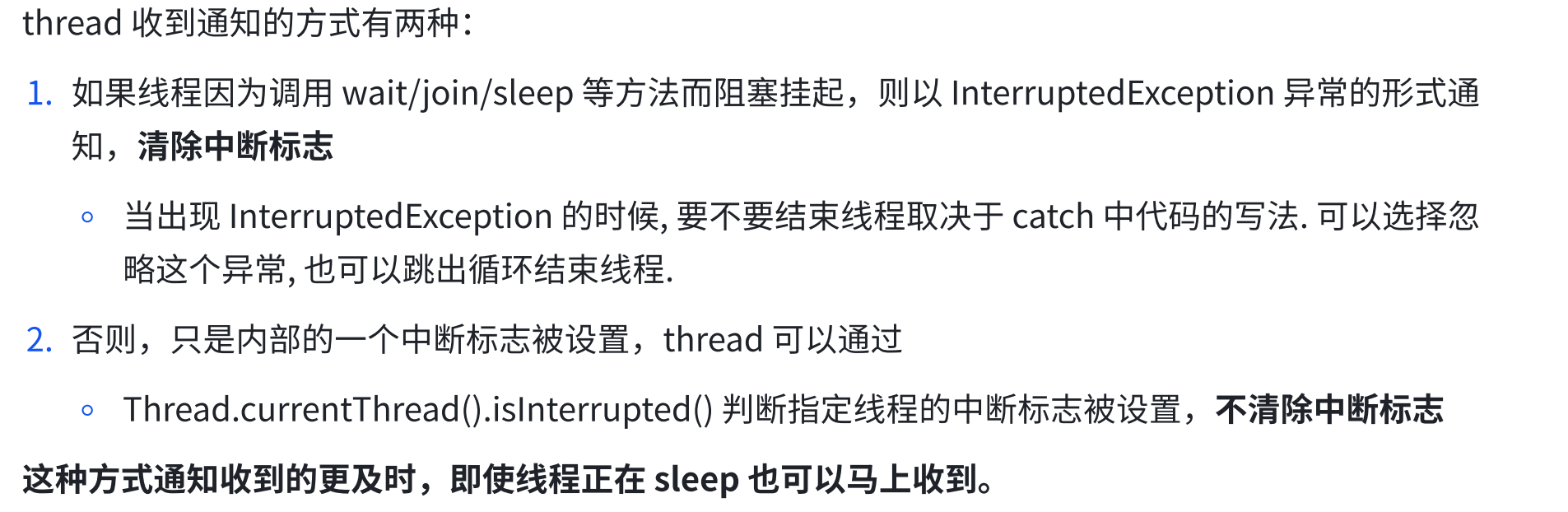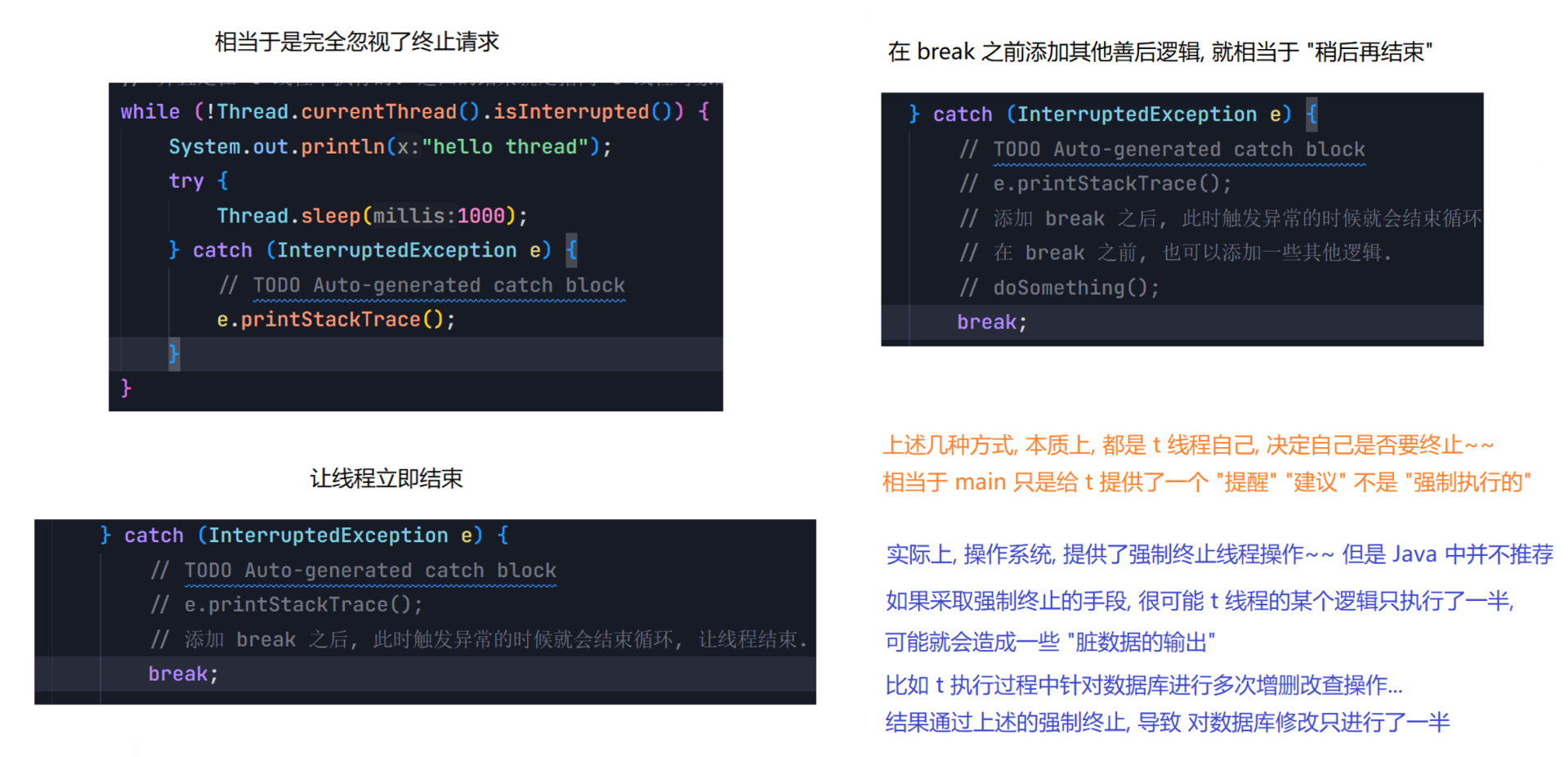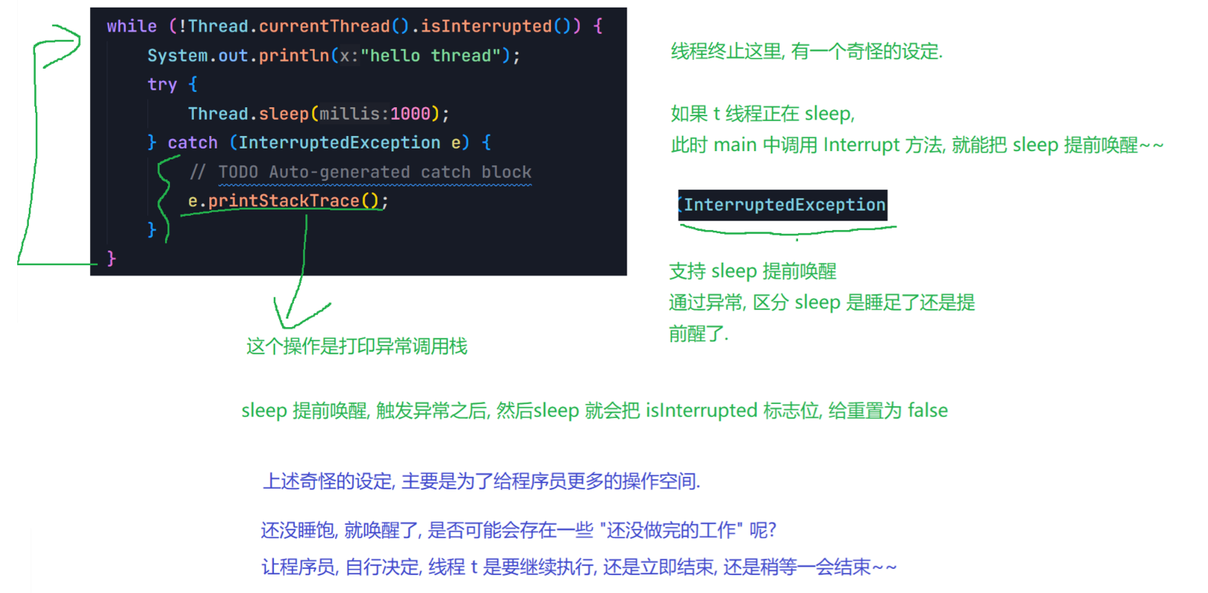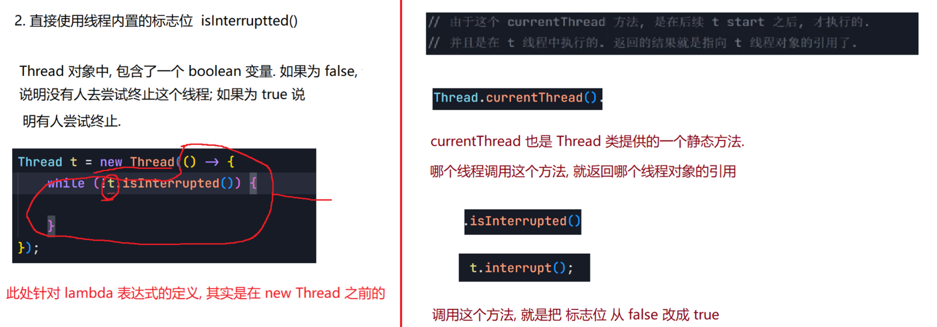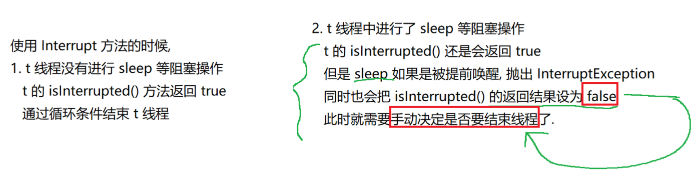 package thread;public class Demo7 {public static void main(String[] args) throws InterruptedException {Thread t = new Thread(() -> { while(Thread.currentThread().isInterrupted()){System.out.println("hello thread");try {Thread.sleep(1000);} catch (InterruptedException e) {// TODO Auto-generated catch blocke.printStackTrace();}}});t.start();System.out.println("hello main");Thread.sleep(3000);t.interrupt();System.out.println("t 线程的中断标志位:" + t.isInterrupted());}}