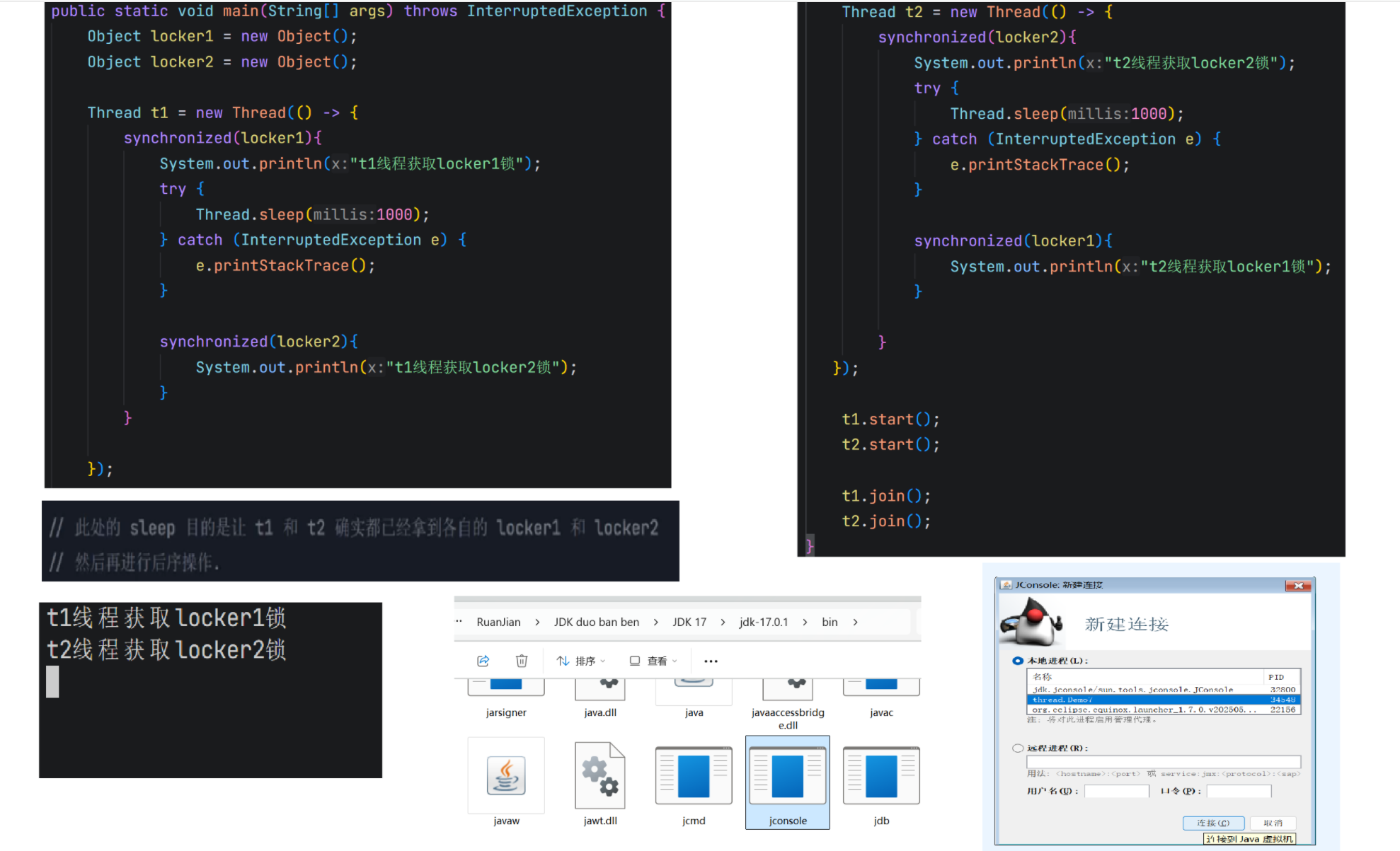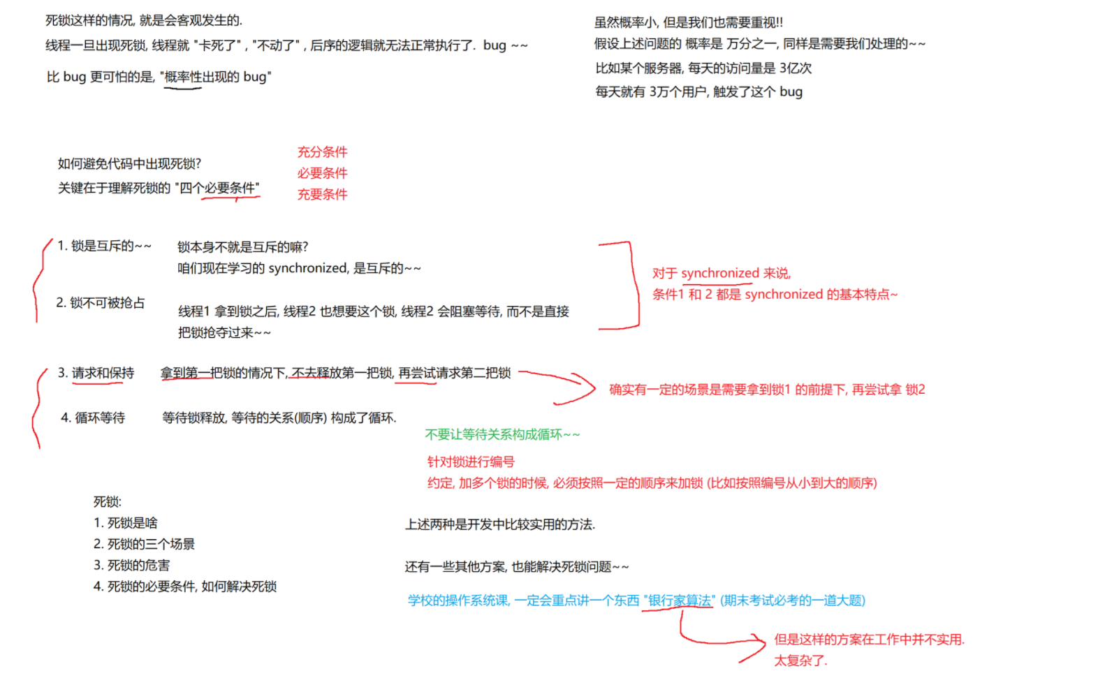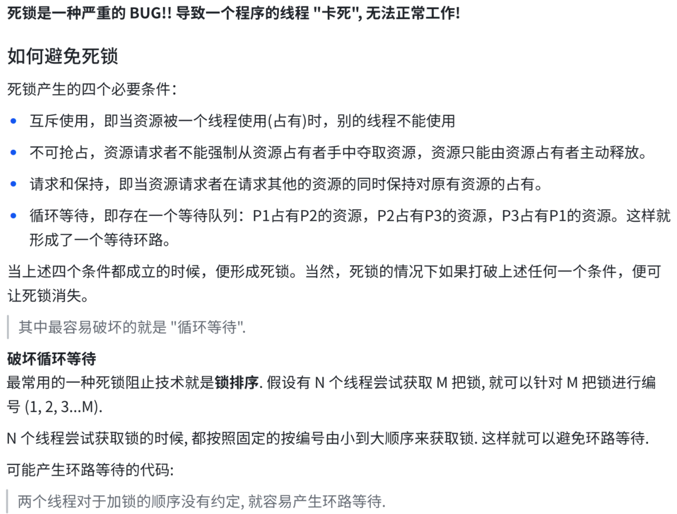 Object lock1 = new Object();Object lock2 = new Object();Thread t1 = new Thread() {@Overridepublic void run() {synchronized (lock1) {synchronized (lock2) {// do something...}}}};t1.start();Thread t2 = new Thread() {@Overridepublic void run() {synchronized (lock2) {synchronized (lock1) {// do something...}}}};t2.start();不会产生环路等待的代码:约定好先获取lock1,再获取lock2,就不会环路等待。