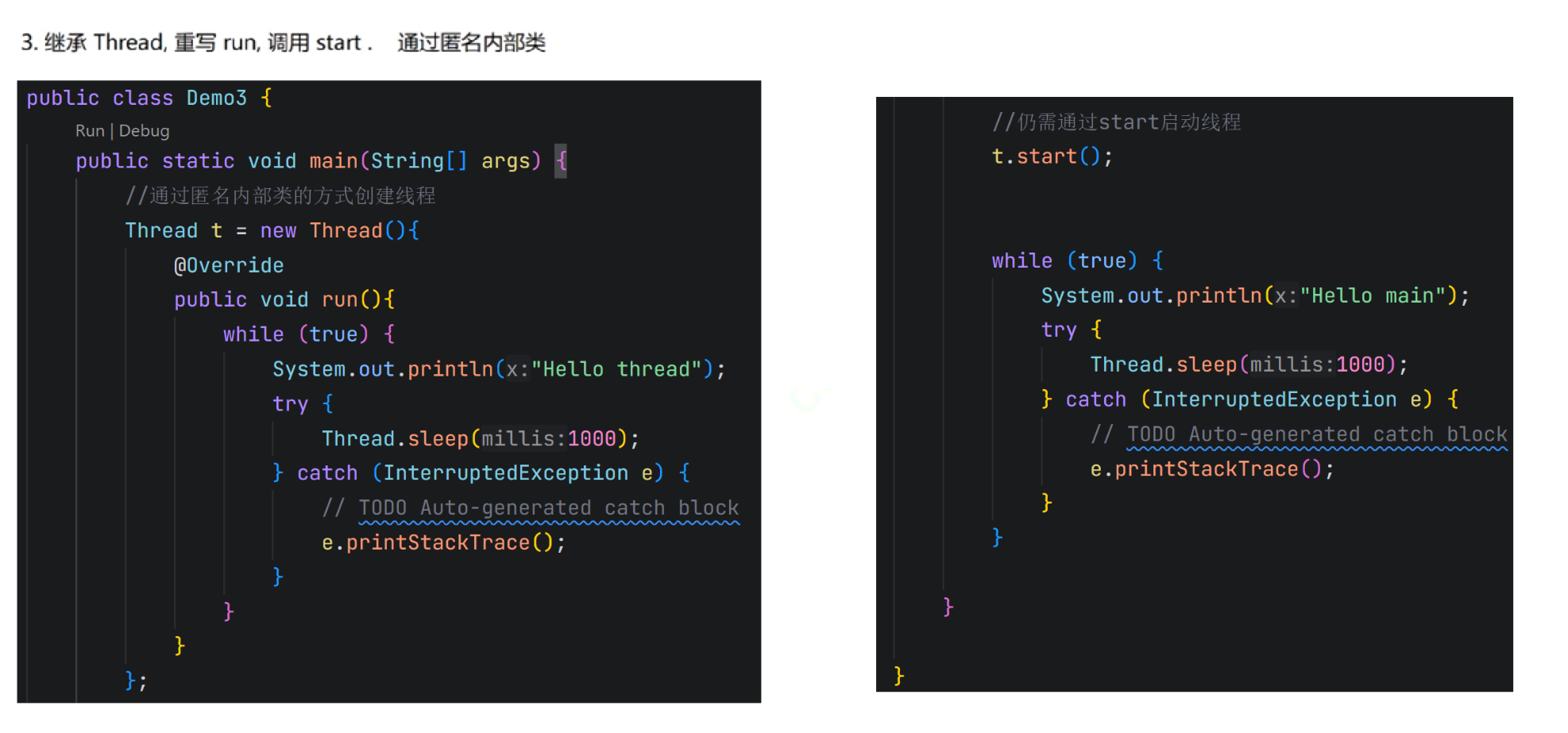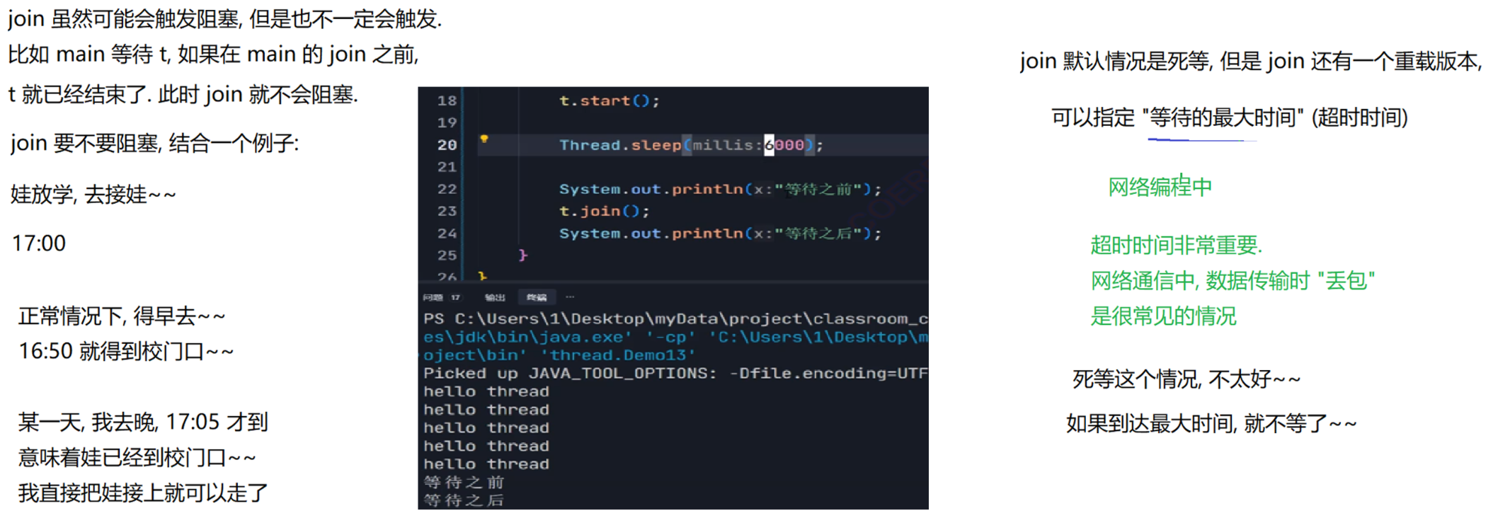 package thread;public class Demo7 {public static void main(String[] args) throws InterruptedException {Thread mainThread = Thread.currentThread();Thread t = new Thread(() -> {try {System.out.println("t 线程等待之前");mainThread.join();System.out.println("t 线程等待之后");} catch (InterruptedException e) {// TODO Auto-generated catch blocke.printStackTrace();}});t.start();for(int i = 0; i < 3; i++){System.out.println("hello main");Thread.sleep(1000);}}