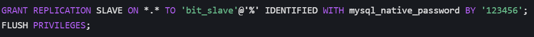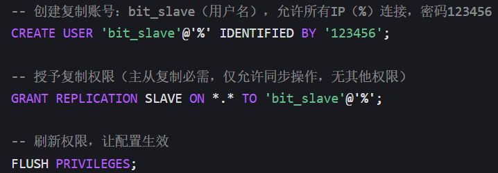 主库必须创建一个授权账号,从库才能通过该账号连接主库同步数据,执行 SQL: