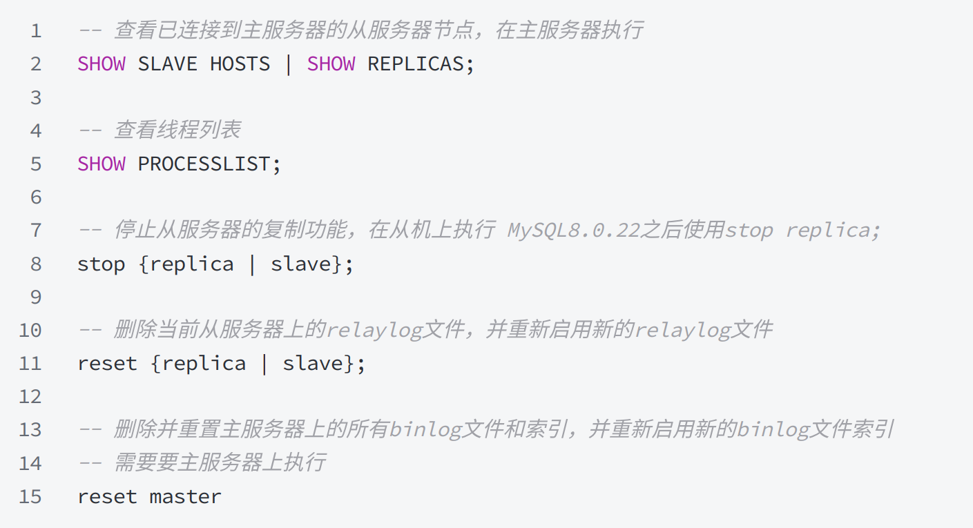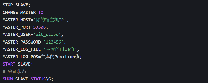 CHANGE MASTER TO,填入主库的 IP、端口、复制账号密码,以及主库的File和Position; - 启动复制并验证:执行