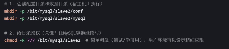 docker run -v 宿主机目录:容器内目录时,Docker 会自动帮你在宿主机创建这个目录,但目录的「权限可能不对」(比如所有者是 root,容器内 MySQL 进程没权限读写,导致服务启动失败)。 - 正确做法(实操步骤):先在宿主机执行命令,创建目录并给对权限(以从库 2 为例):
