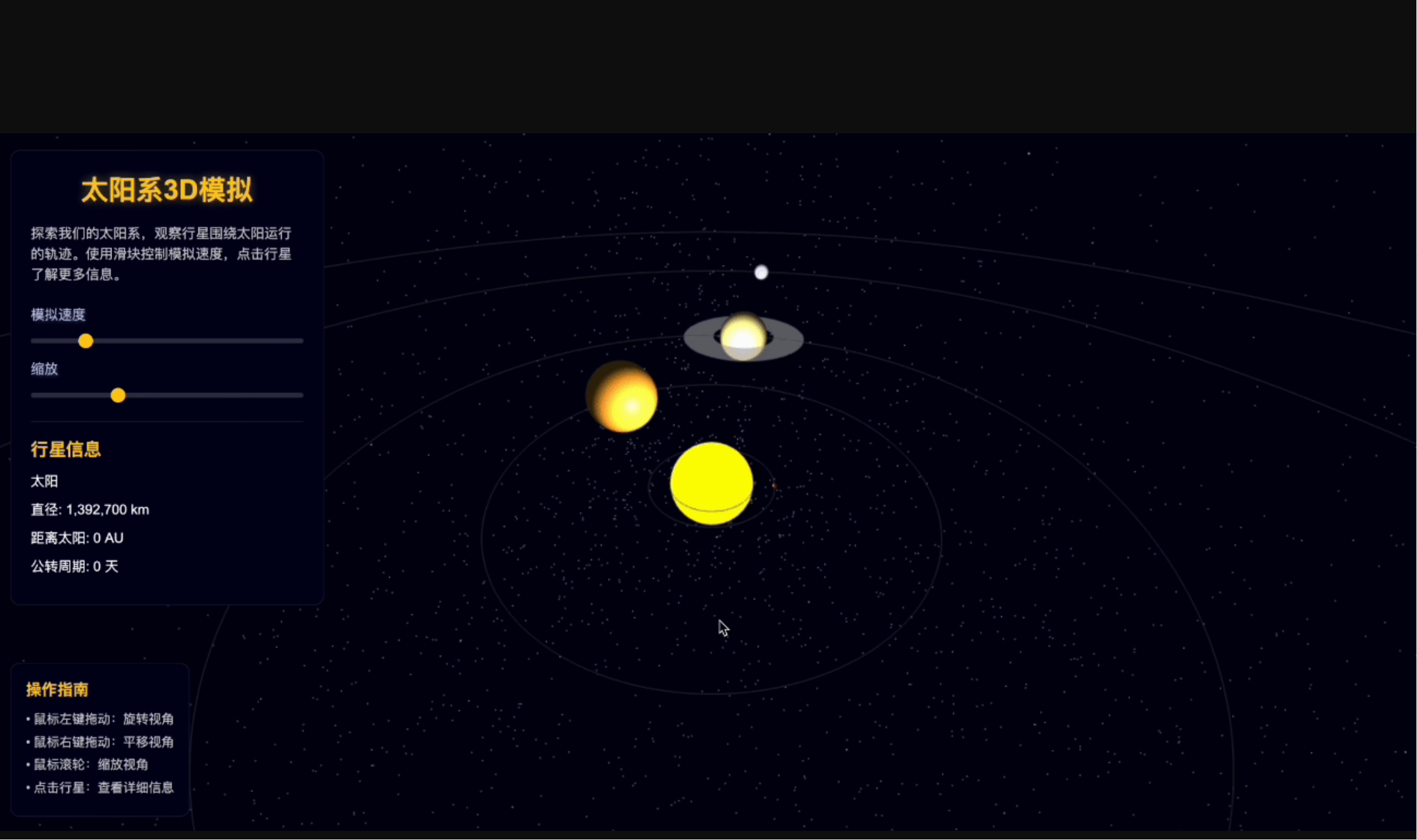 第二个测试我选了一个更偏“结构推理”的场景:让文心 5.0 去生成一段“太阳系 3D 运行模拟”的小动画,看它能不能不靠死记硬背,而是真正理解轨道、光影、节奏这些物理关系。